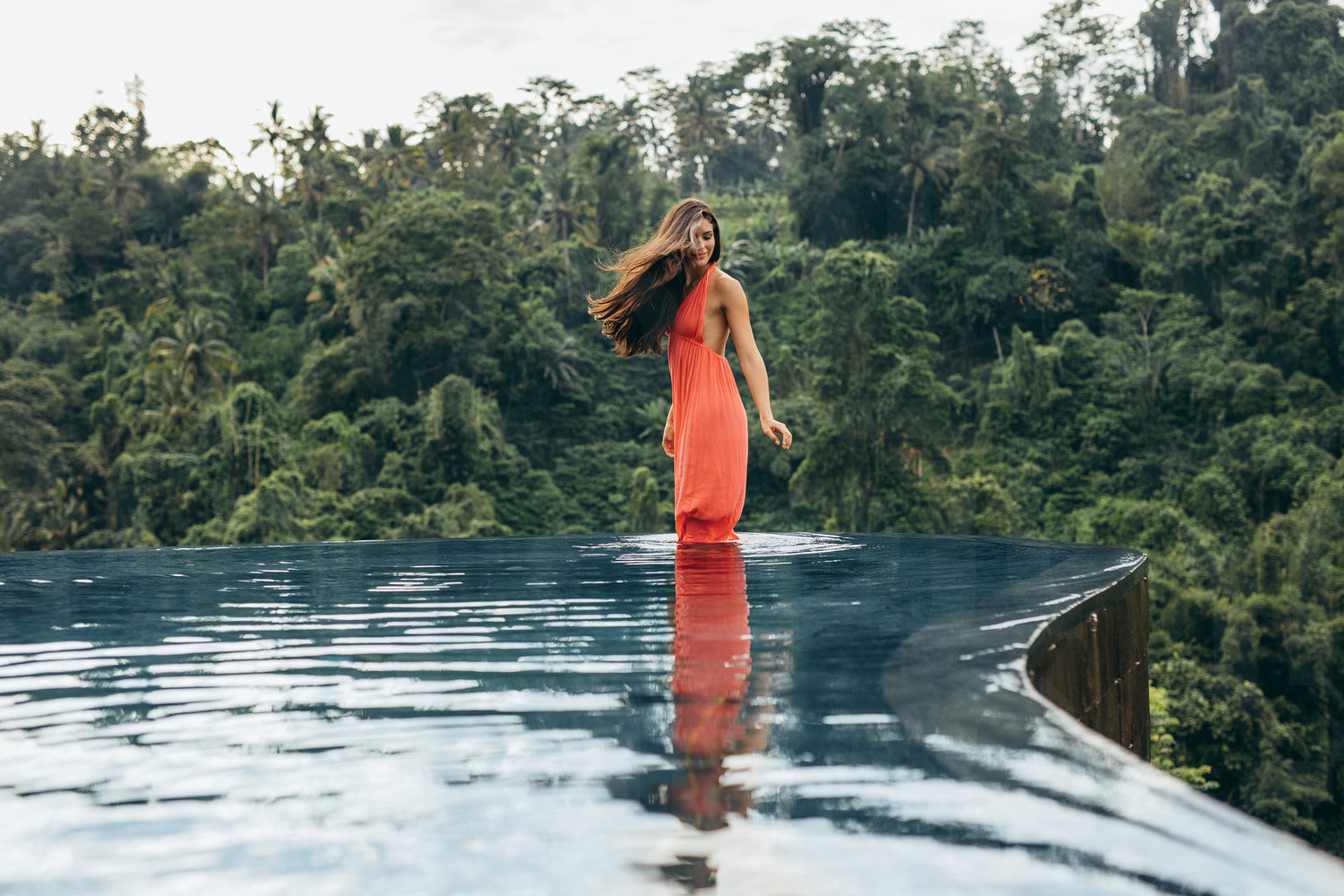 Shot of attractive young woman in swimming pool. Caucasian female model inside the pool of luxury resort.