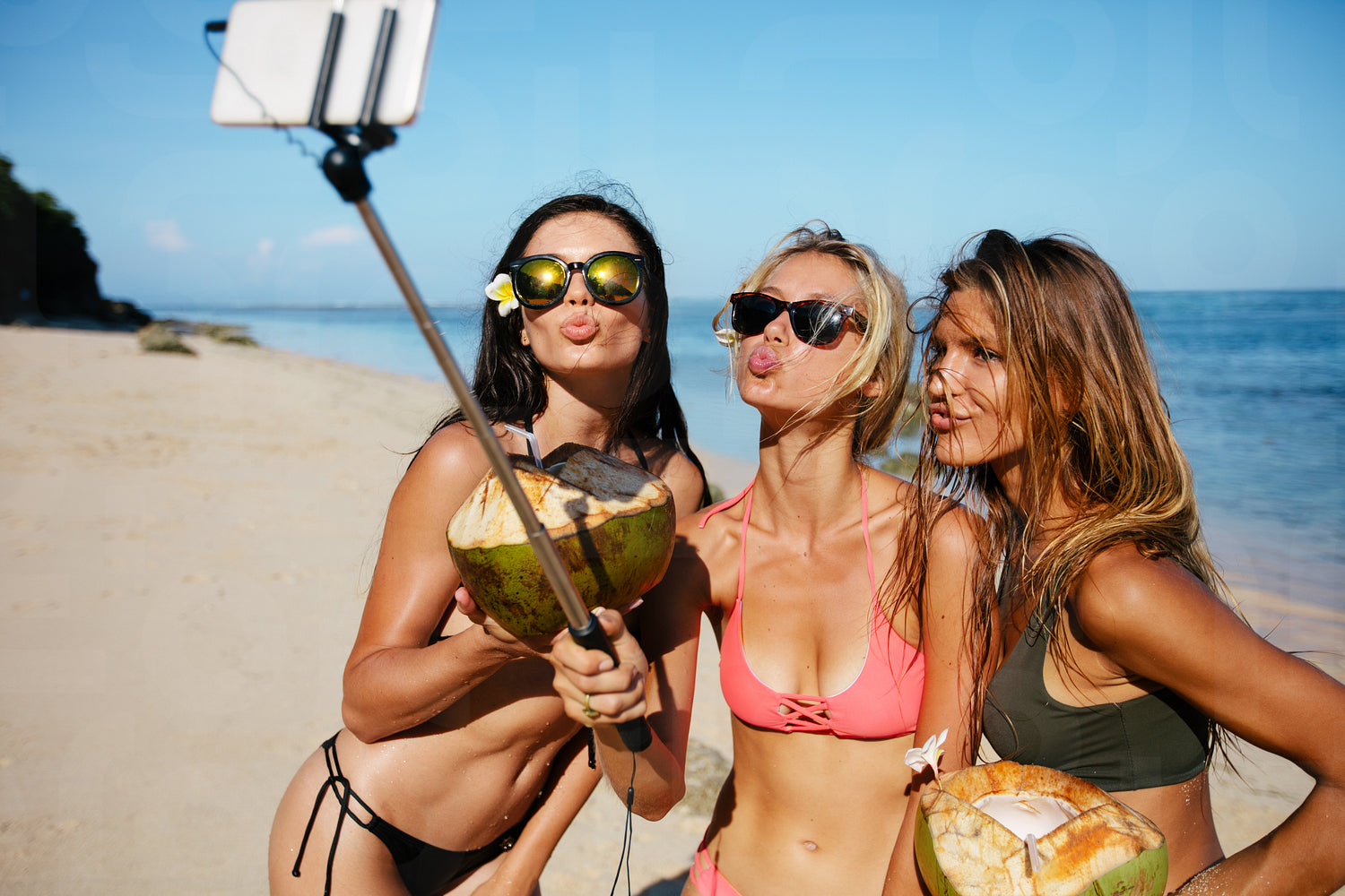Three young women in swimsuit on the beach enjoying holidays and taking self portrait selfie stick. Group of female friends with coconuts taking selfie on the sea shore. Pout for a selfie on beach.