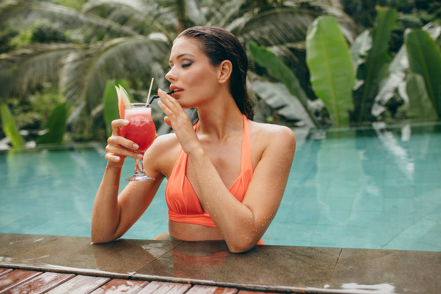 Portrait of young woman drinking cocktail while standing in swimming pool. Caucasian female model in bikini at luxury holiday resort.