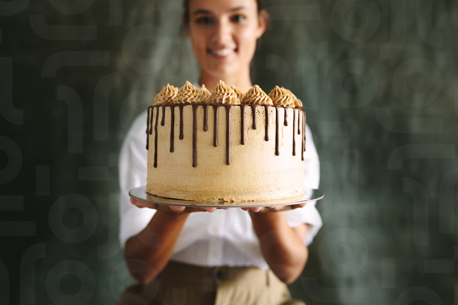 Female baker holding a delicious cake. Chef holding freshly made cake against gray background.