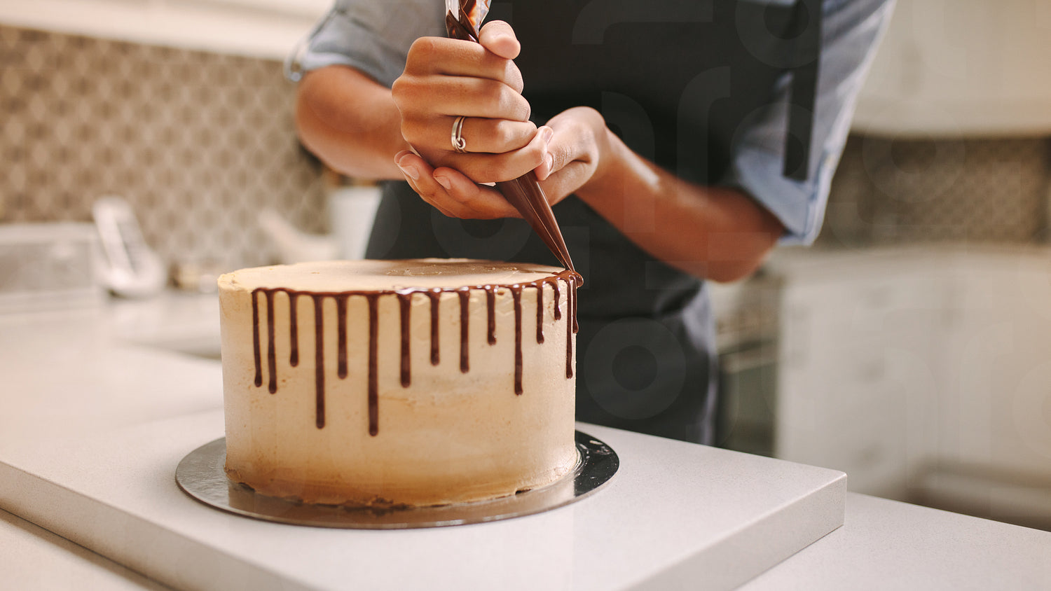 Close up of hands of a female chef with confectionery bag squeezing liquid chocolate on cake. Pastry chef decorating a cake in kitchen.