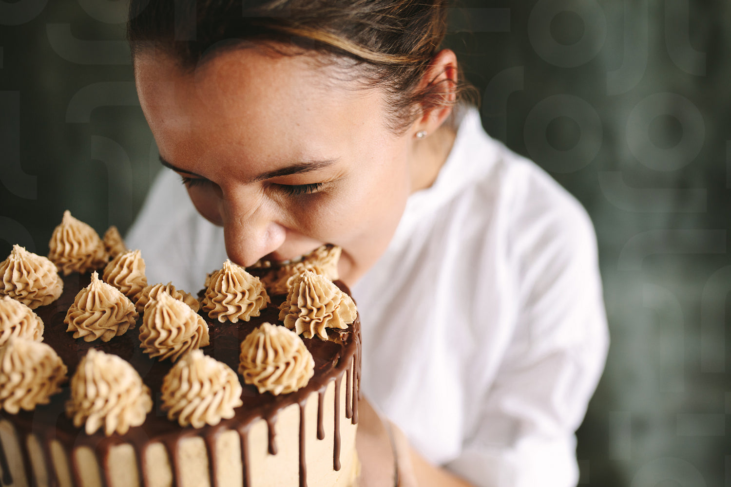 Female confectioner taking a big bite of a cake. Pastry chef eating whole cake.