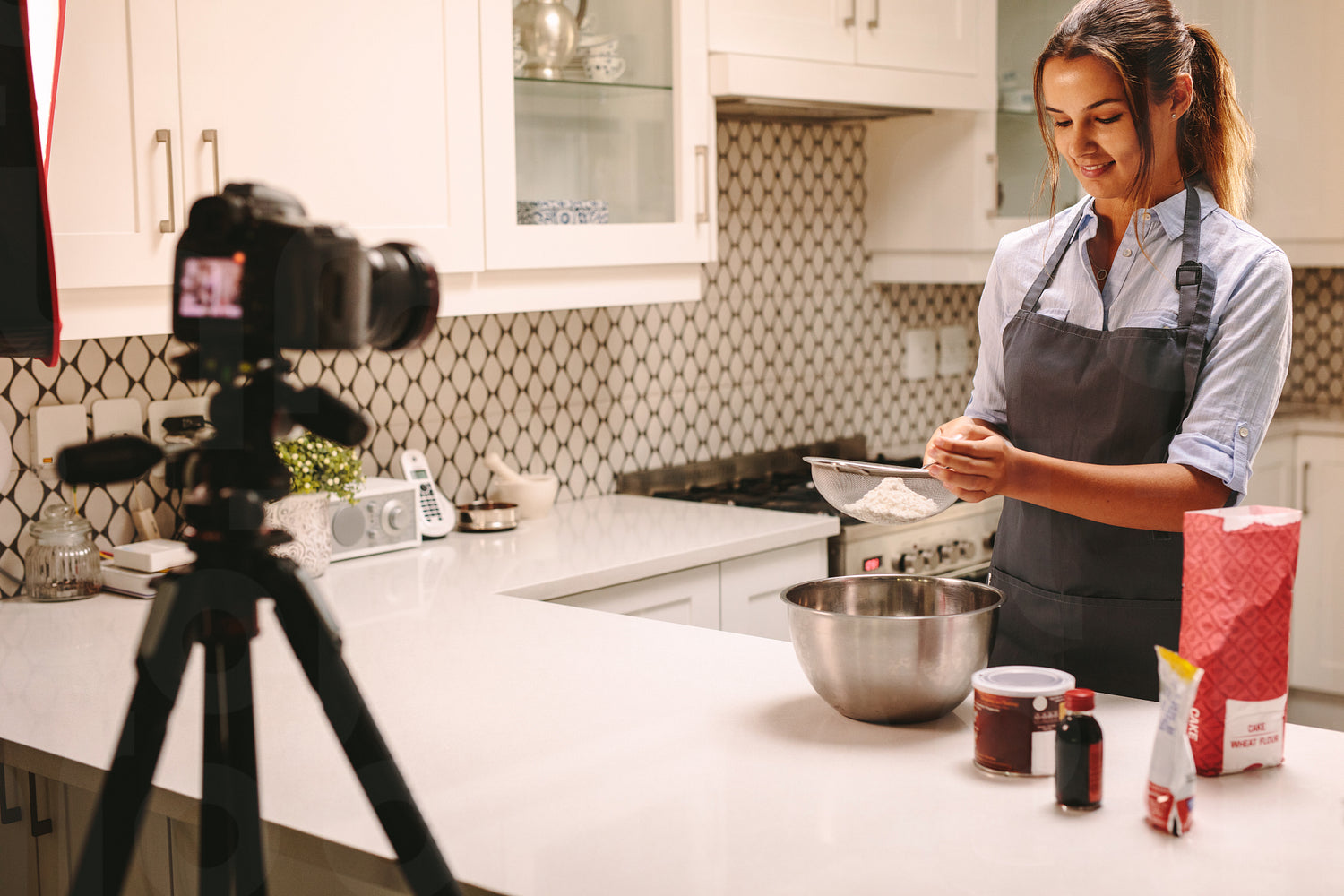 Video camera filming young female blogger at the kitchen. Woman pastry chef sifting flour in a bowl to make dough with a digital camera recording the session for a food video blog.
