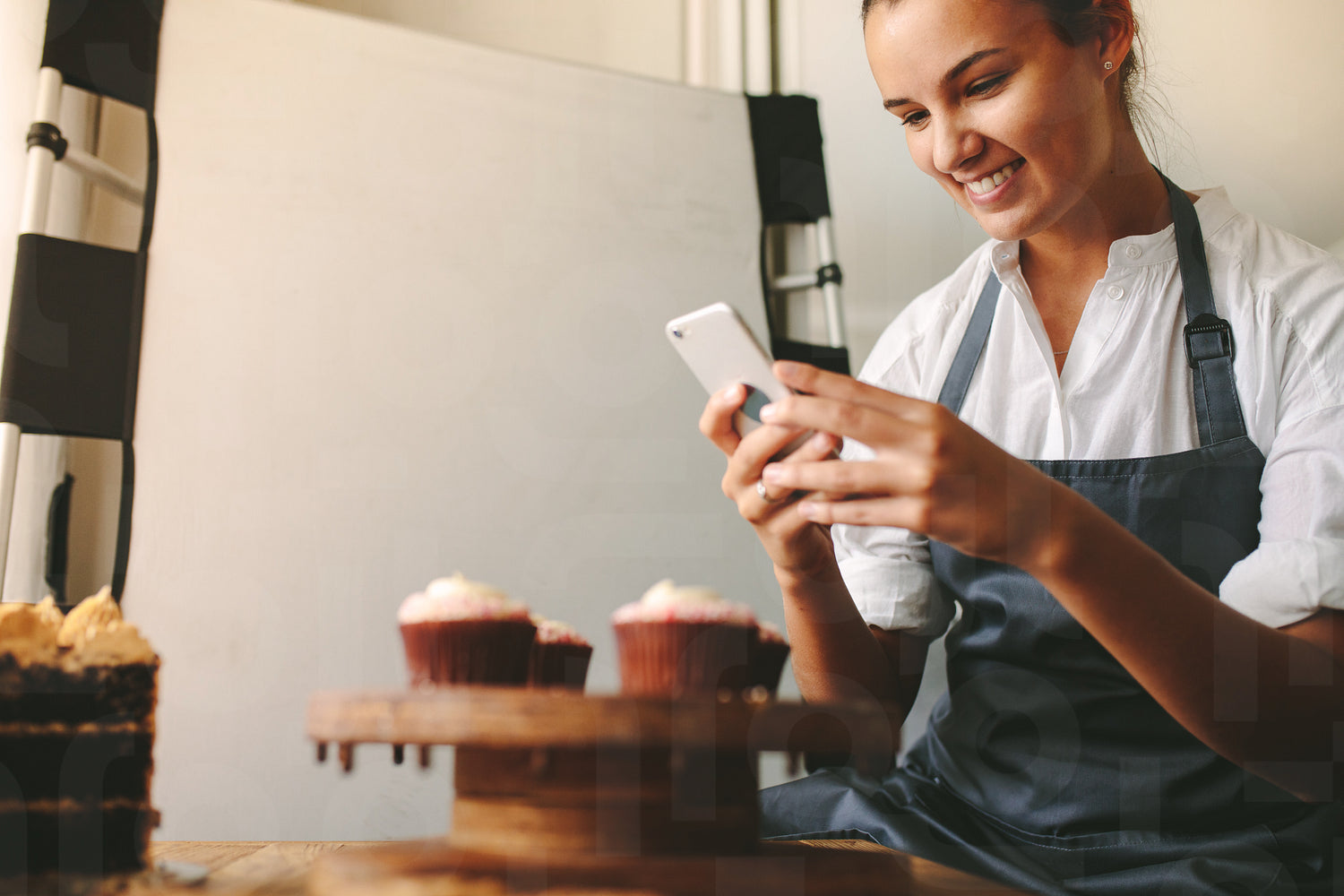 Young woman taking a pictures while cooking tasty pastry in the kitchen. Happy woman taking a picture of cupcakes on a wooden board with mobile phone while standing at the kitchen.