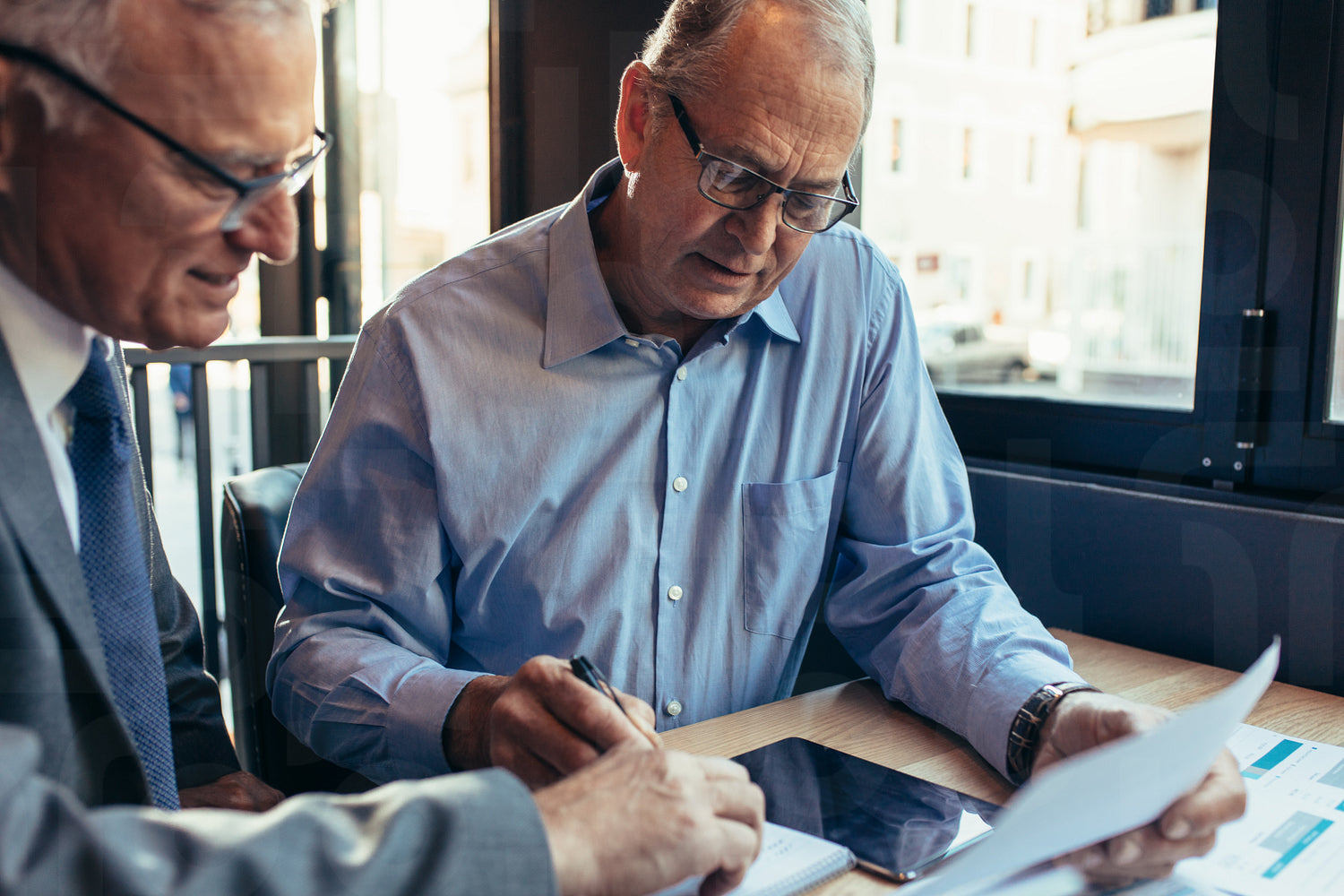 Two coworkers working on a project while at a cafe. Senior businessmen working together in a cafe, making notes.