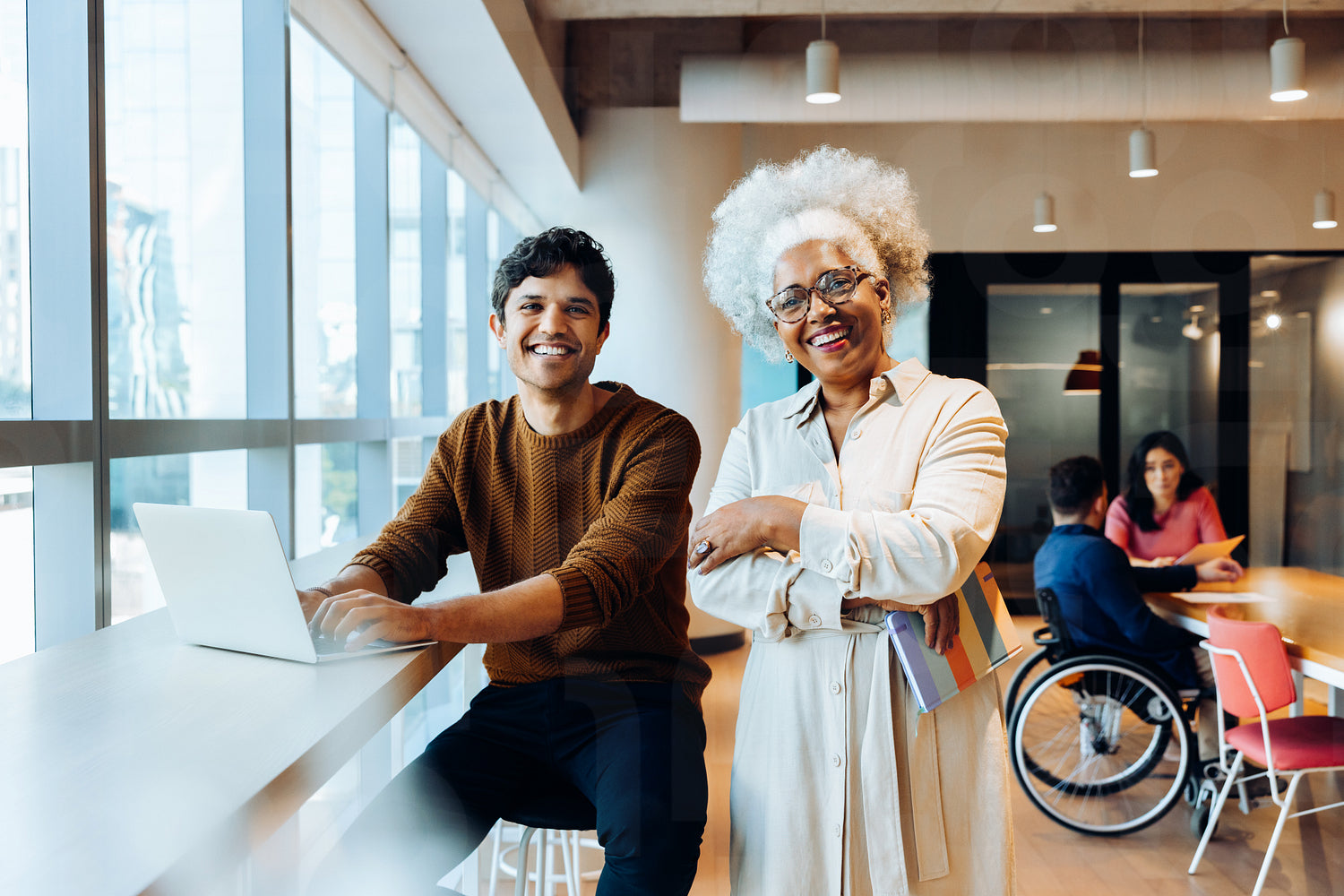 Two colleagues in a modern office with a laptop and a senior woman in a dress, depicting teamwork and inclusive work culture.