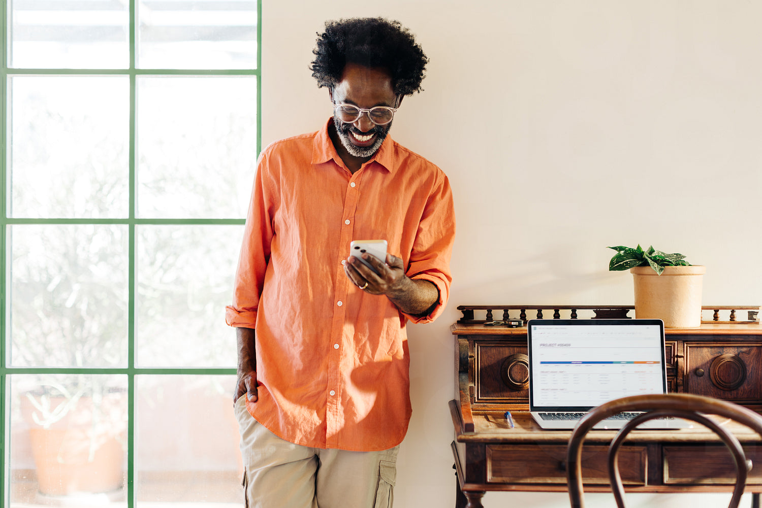 Black man with afro hair reading a text message on his mobile phone in his home office. Happy mature man standing against a wall, using technology to communicate with his colleagues.