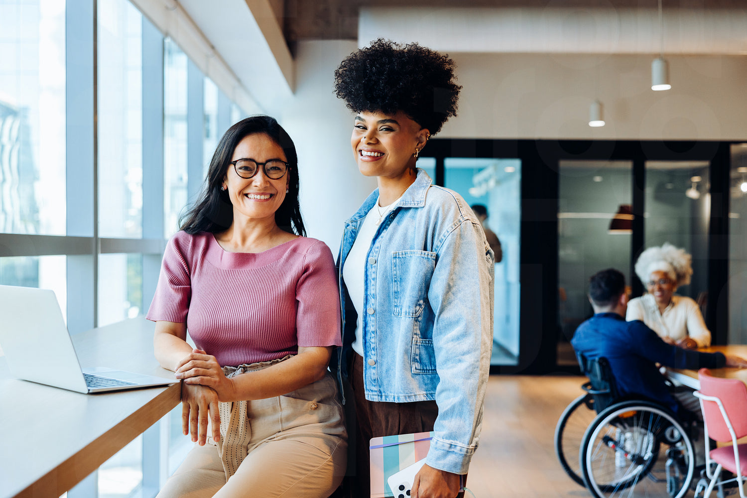 Two women stand by a laptop in a modern office, smiling, with colleagues in a wheelchair in the background.