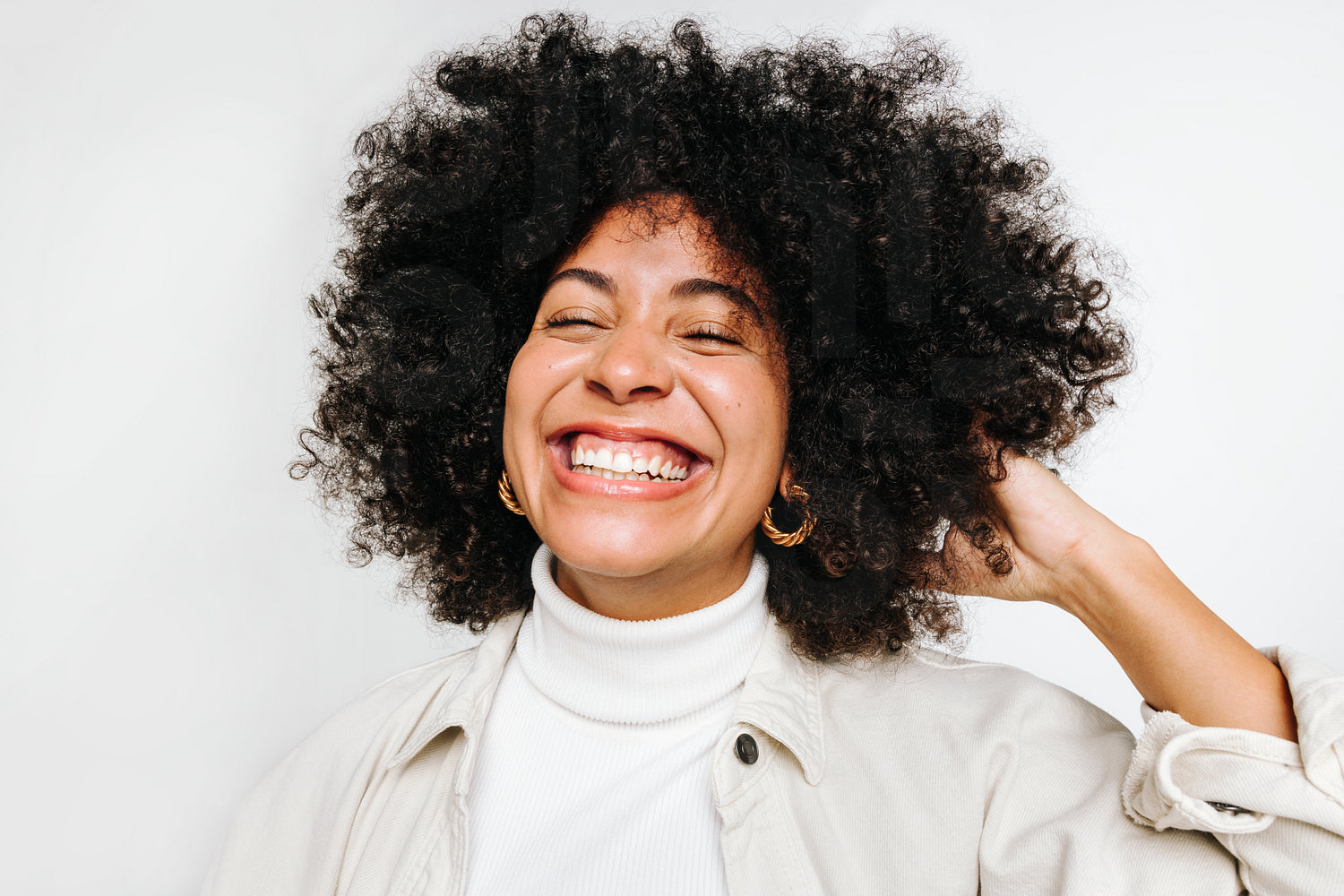 Curly and happy. Young woman with Afro hair laughing cheerfully while standing against a white background. Portrait of a beautiful woman of colour wearing her natural hair with pride.