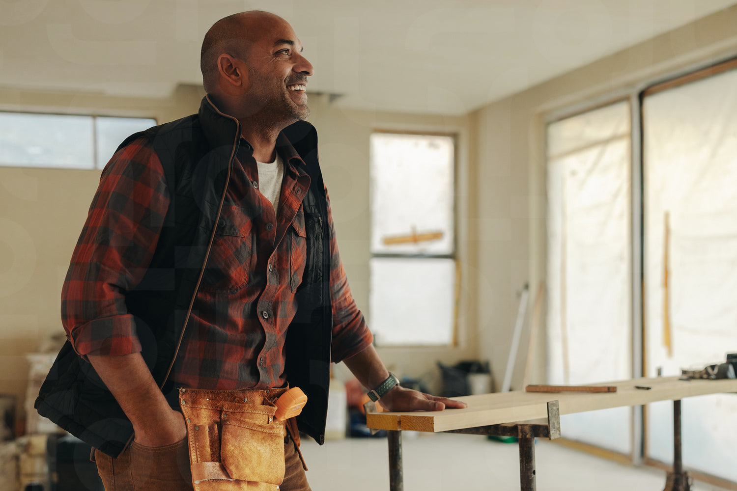 Mature man standing in a kitchen that is undergoing renovation. He wears a tool belt and smiles while working on the upgrade. His DIY expertise ensure a successful home improvement project.