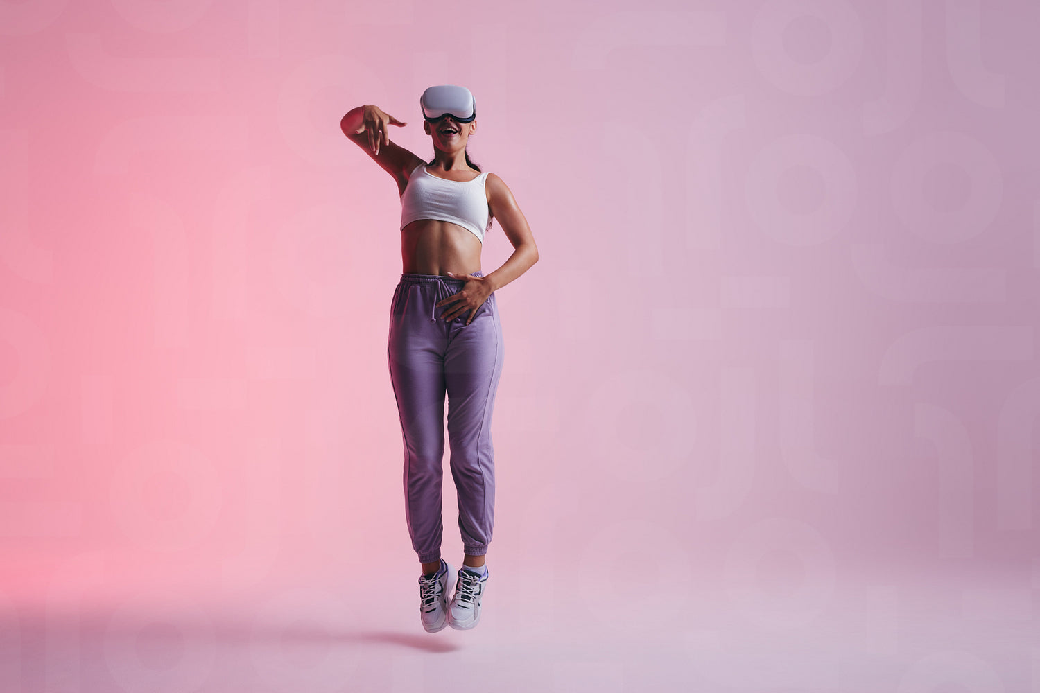Energetic young woman dancing in the metaverse. Active young woman enjoying herself while wearing virtual reality goggles. Woman having fun while exploring 3D technology.