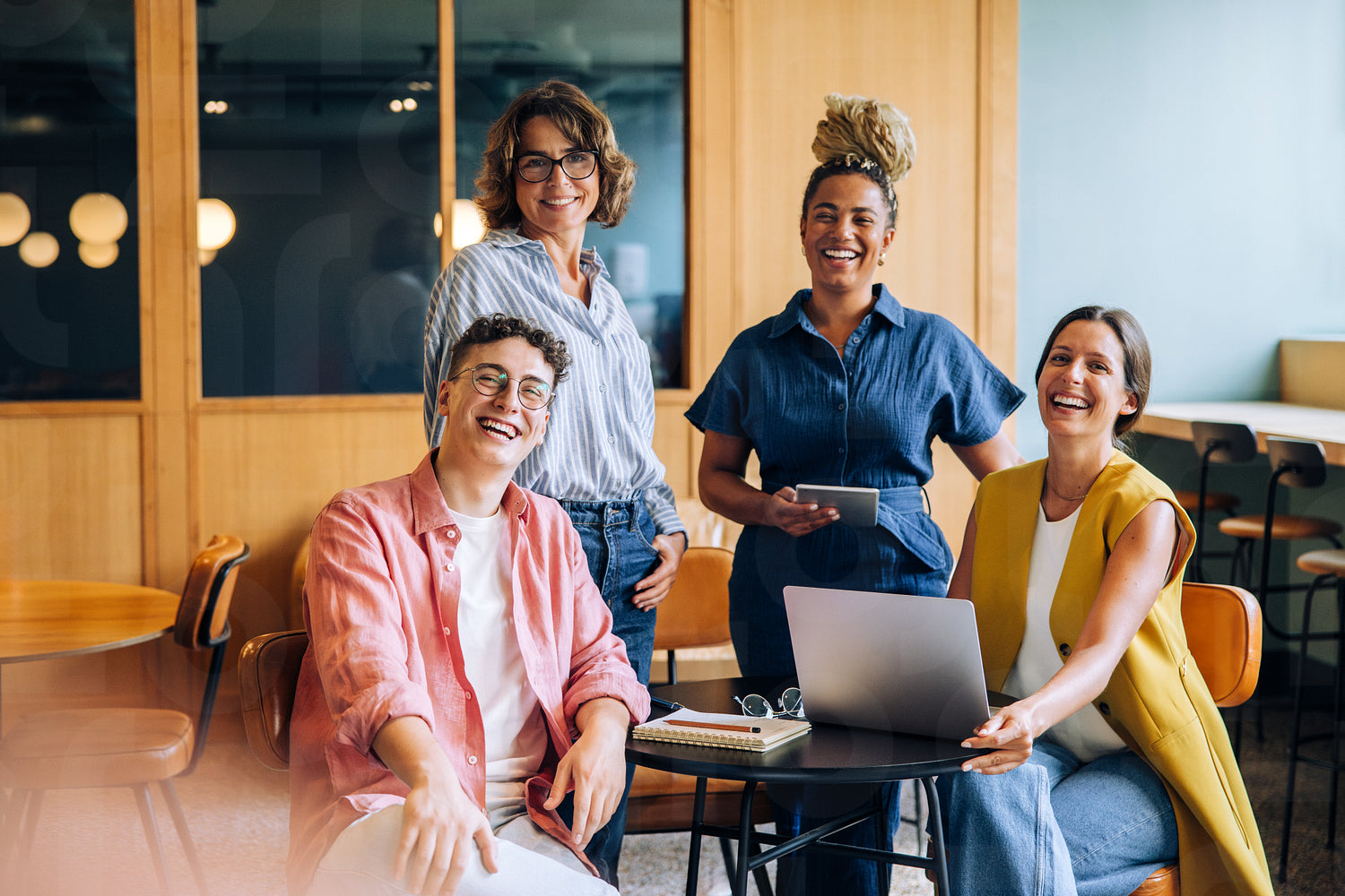 A joyful team of colleagues working together on a project in a stylish office space promoting teamwork and creativity.