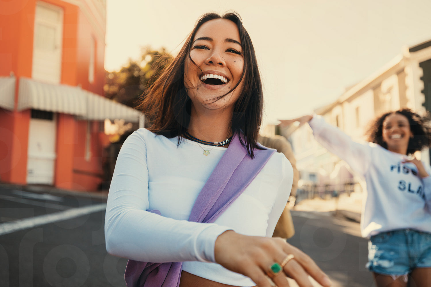 Smiling young women having fun outdoors, capturing moments of joy and friendship in the city streets on a sunny day.