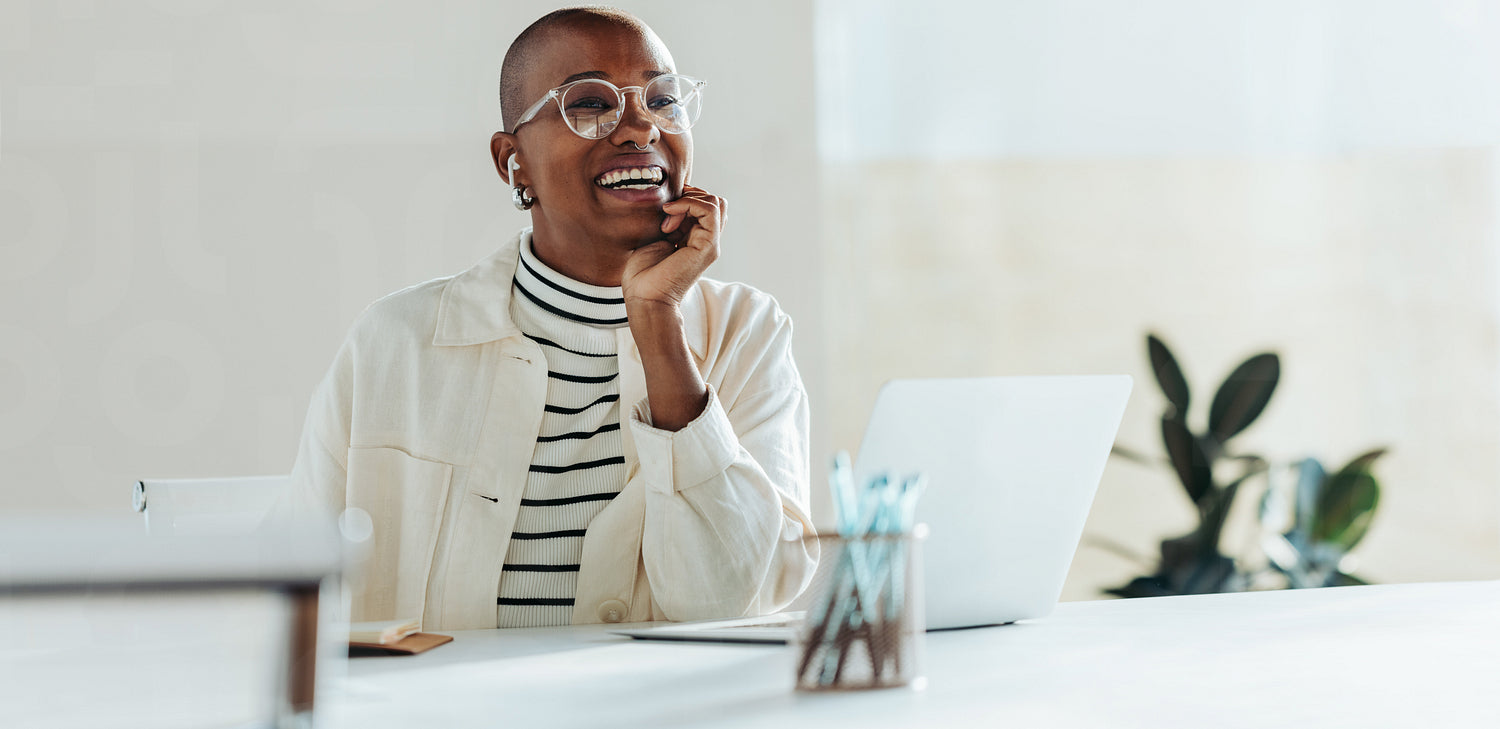 Joyful businesswoman with glasses laughing in a bright office setting, modern workplace, positive work environment