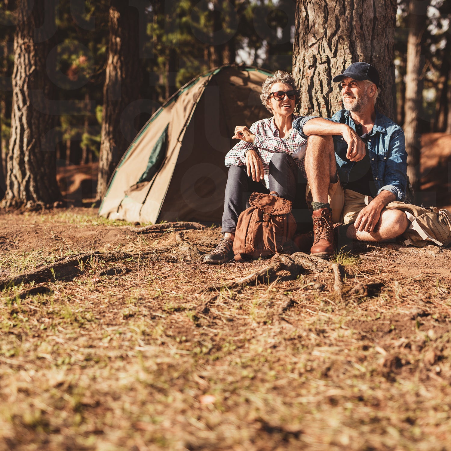 Portrait of happy mature couple sitting together under a tree in forest. Senior man and woman relaxing at their campsite.