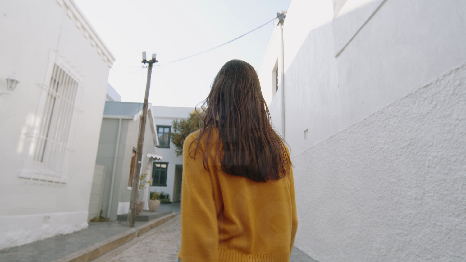 Young woman walking and dancing on the street turning around, holding the camera and blowing a kiss. Beautiful female enjoying outdoors in the city.