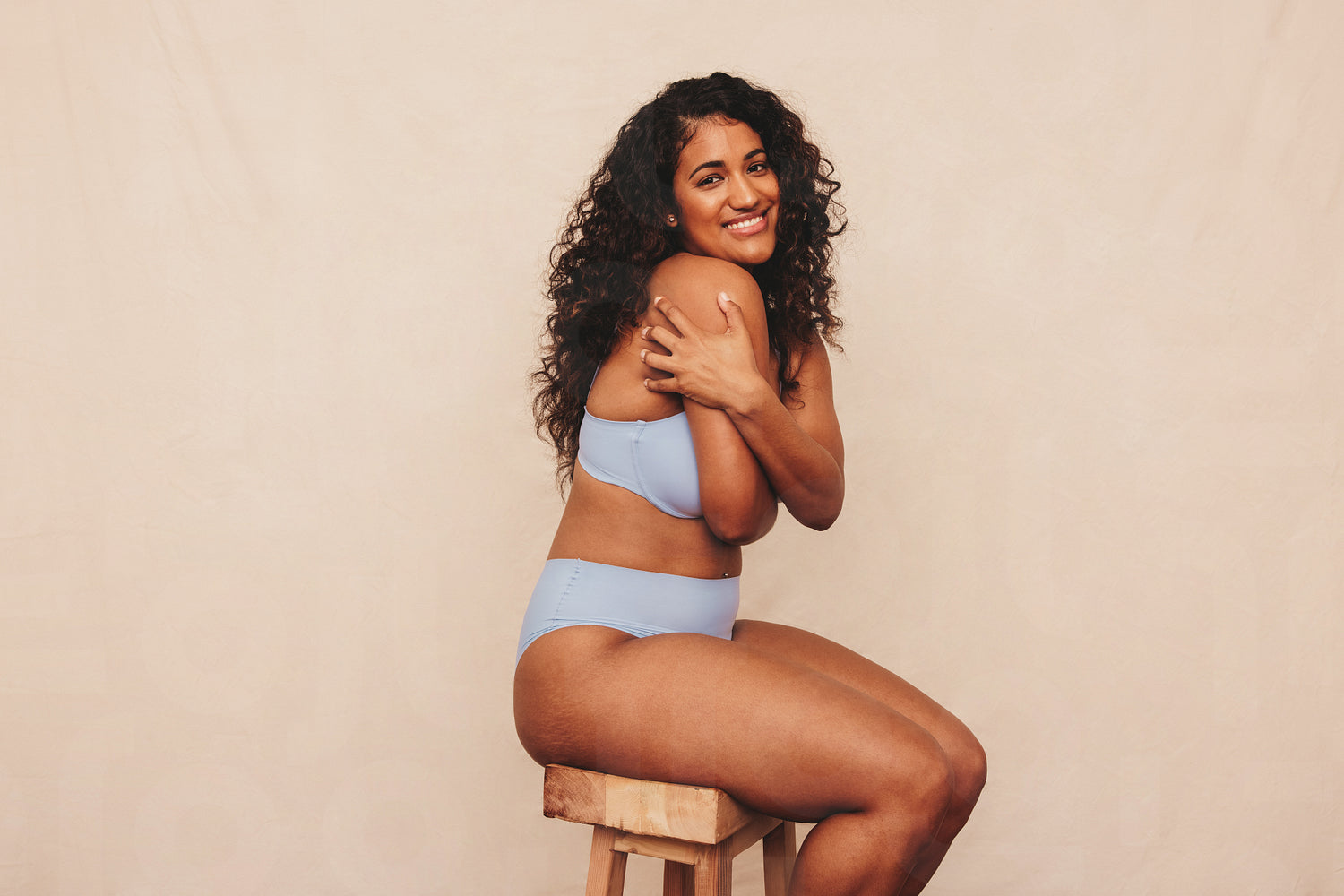 Self loving young woman embracing her natural body. Happy young woman smiling at the camera while sitting against a studio background. Body positive young woman wearing blue underwear in a studio.