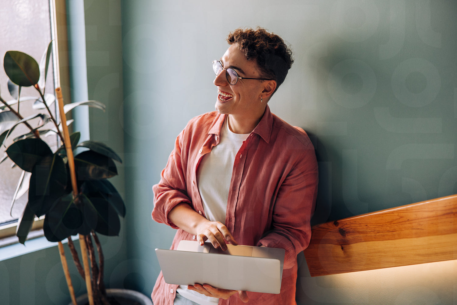 A positive individual in casual attire stands indoors while using a laptop for work. The environment features natural light, a plant, and stylish decor, adding to the contemporary and cheerful vibe.