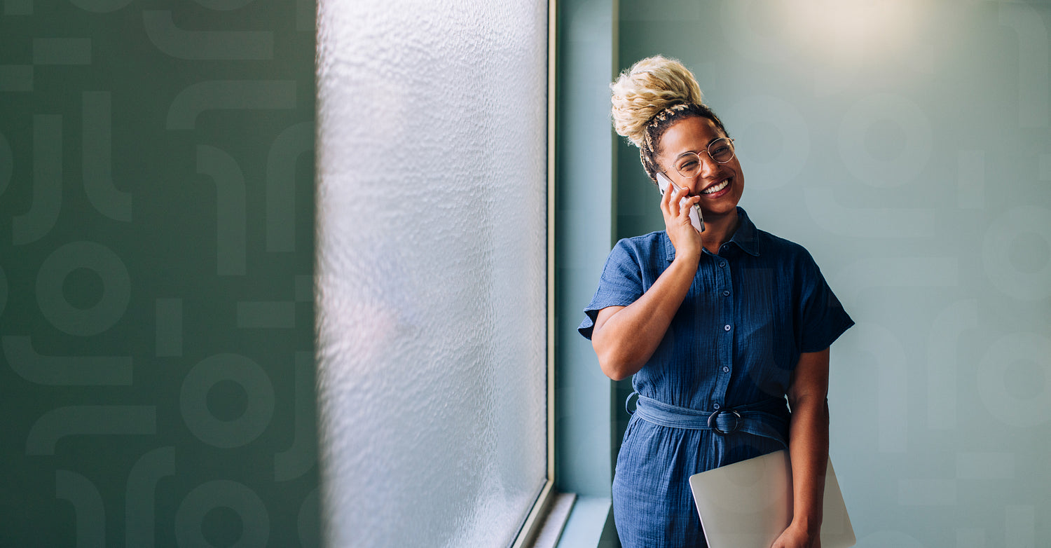 A young black woman stands near a window, smiling while talking on a mobile phone and holding a laptop against a bright wall, conveying confidence and professionalism.