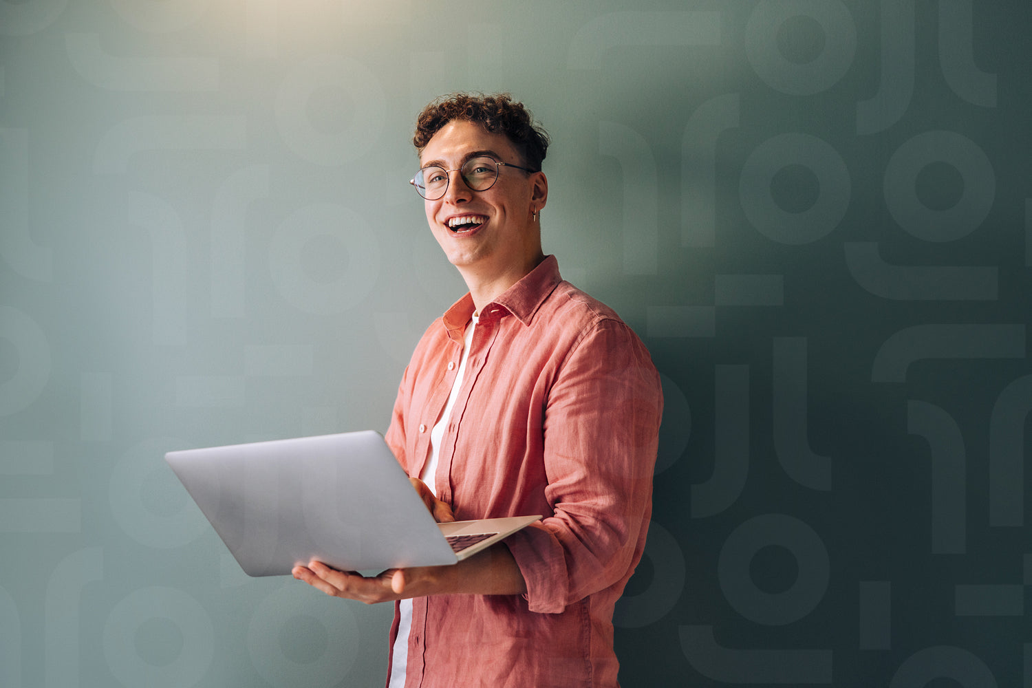 A cheerful young man wearing glasses and a pink shirt holding a laptop against a plain background, expressing positivity and confidence. Ideal for concepts of technology, youth, and enthusiasm.