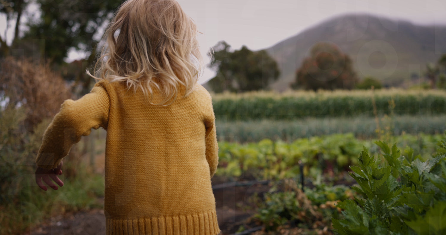 Adorable little girl running towards her big brother in a vegetable garden. Rearview of a little blonde girl going to join her brother on an organic farm.