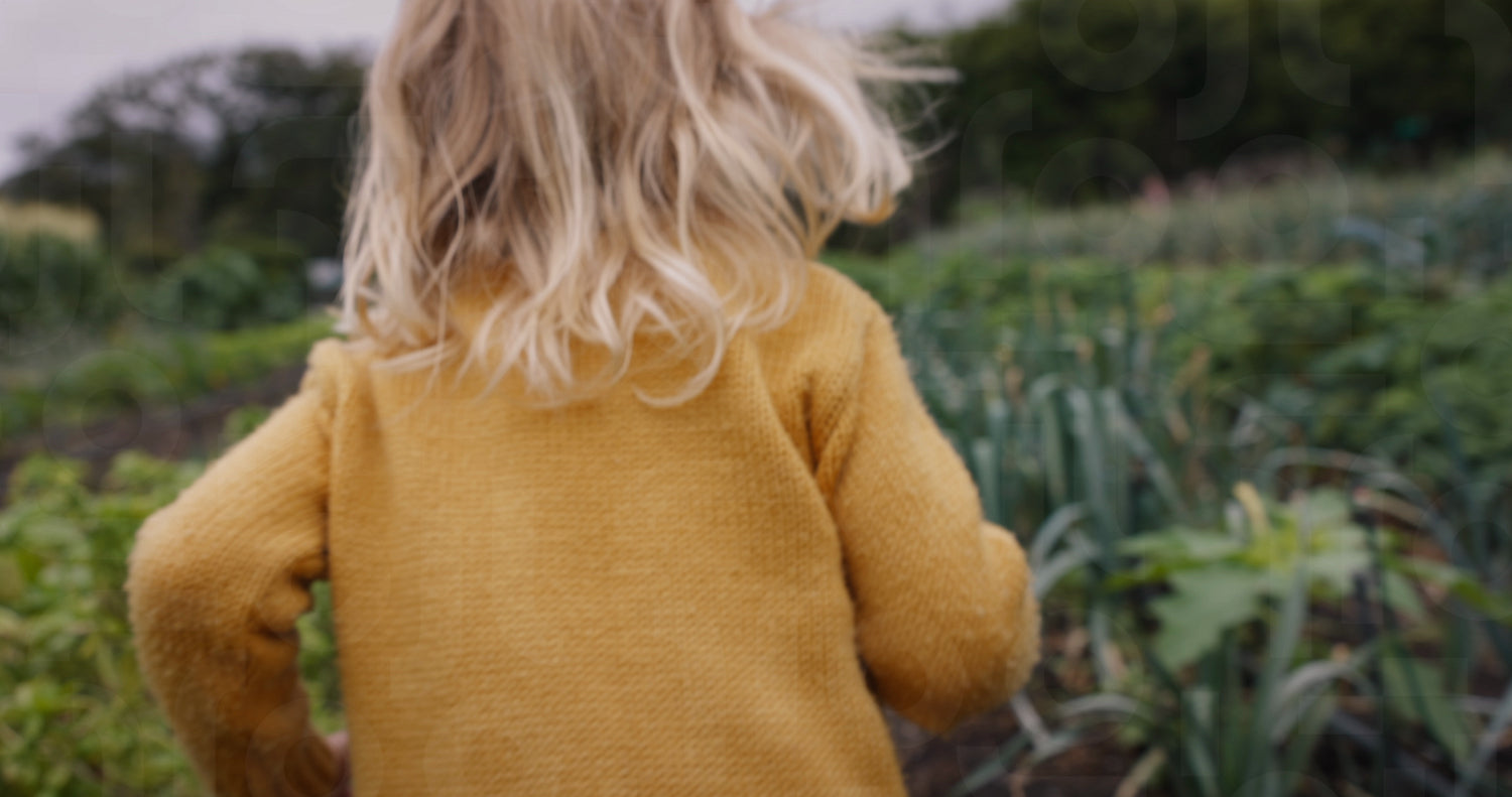 Adorable little girl running towards her mother in a vegetable garden. Rearview of a little blonde girl going to join her mom on an organic farm.