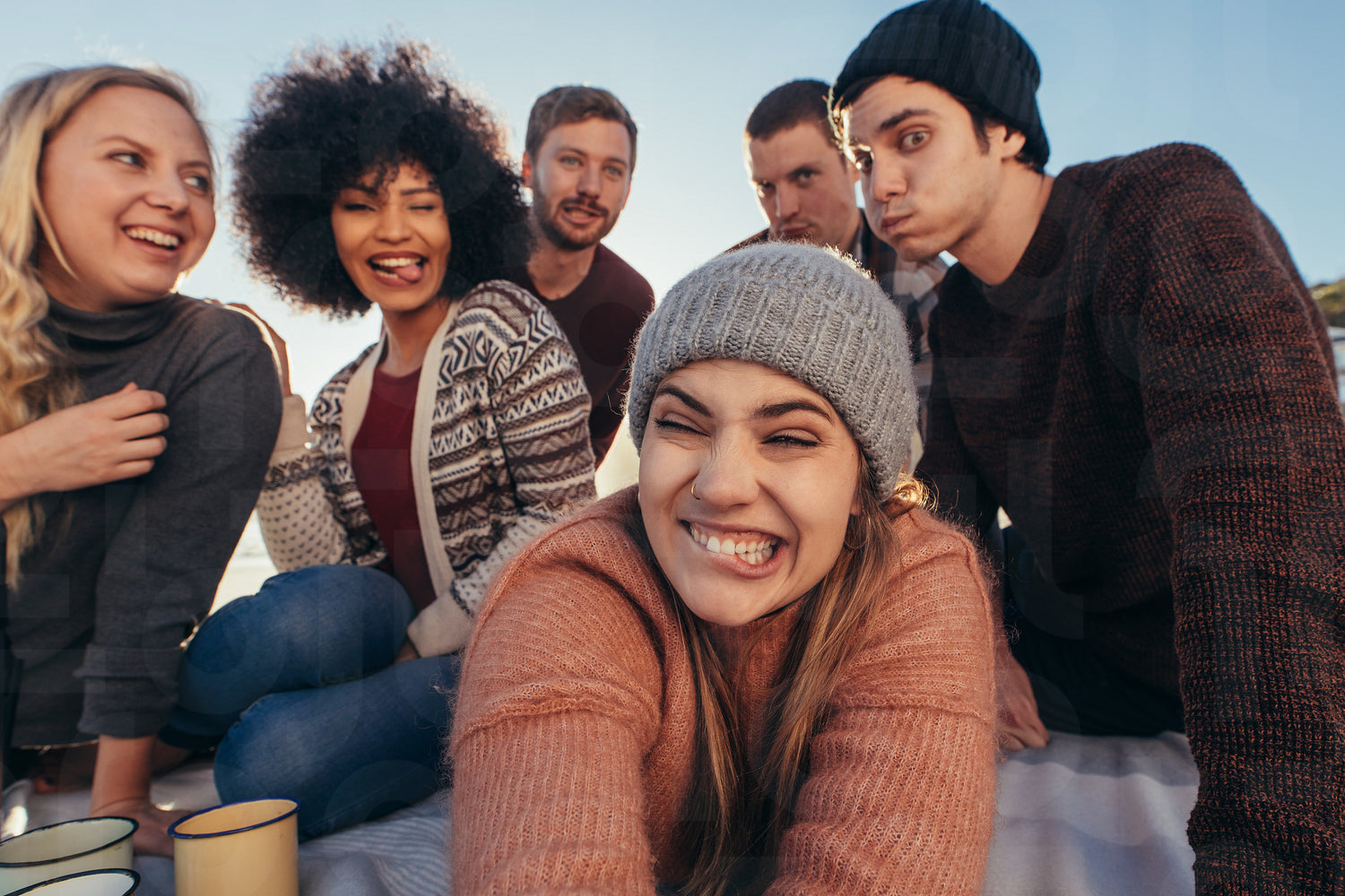 Group of young people making funny faces while taking selfie on the beach. Young people enjoying together at the beach making a self portrait.