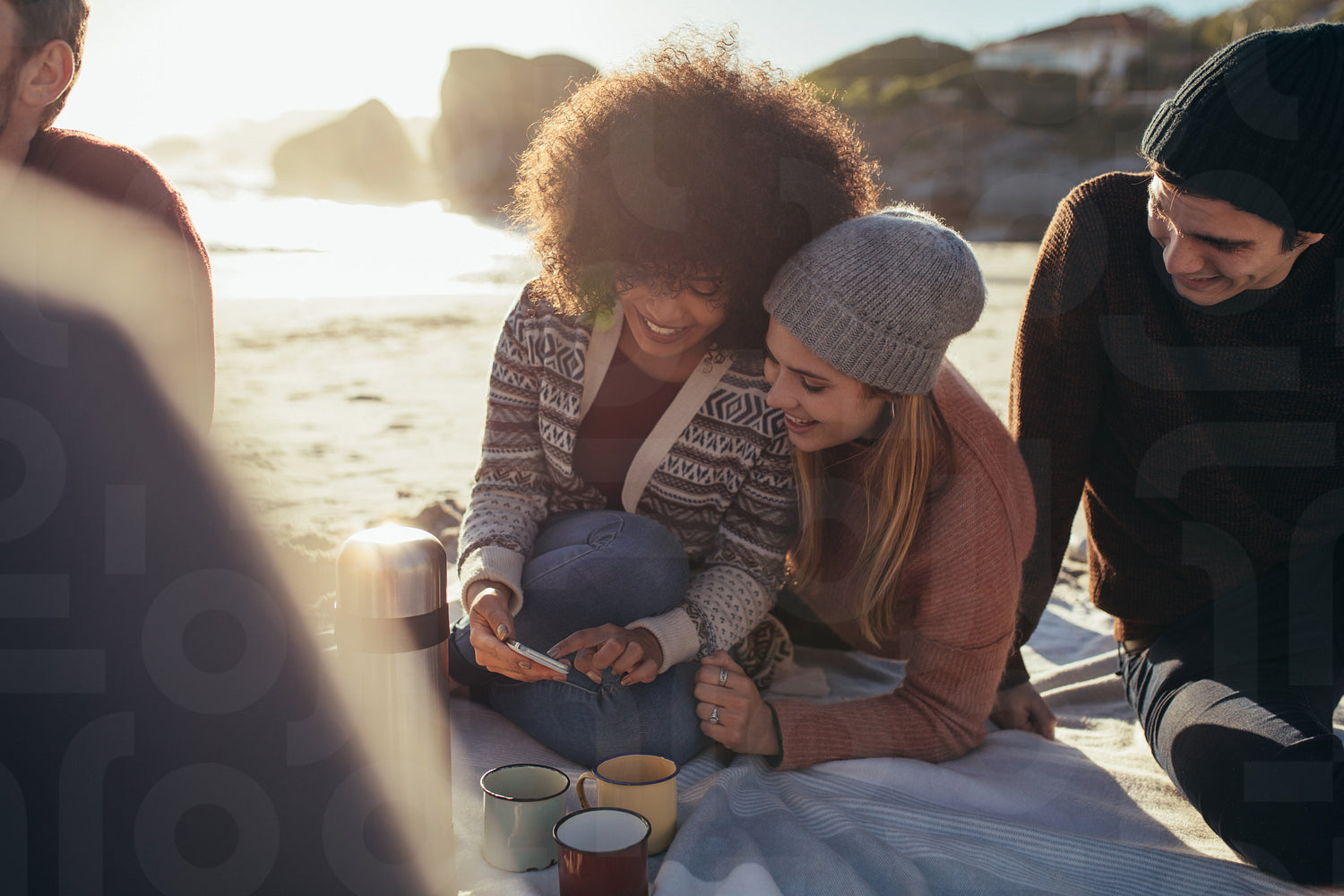 Two young woman relaxing at the seashore with mobile phone. Group of friends sitting at the beach using smartphone.
