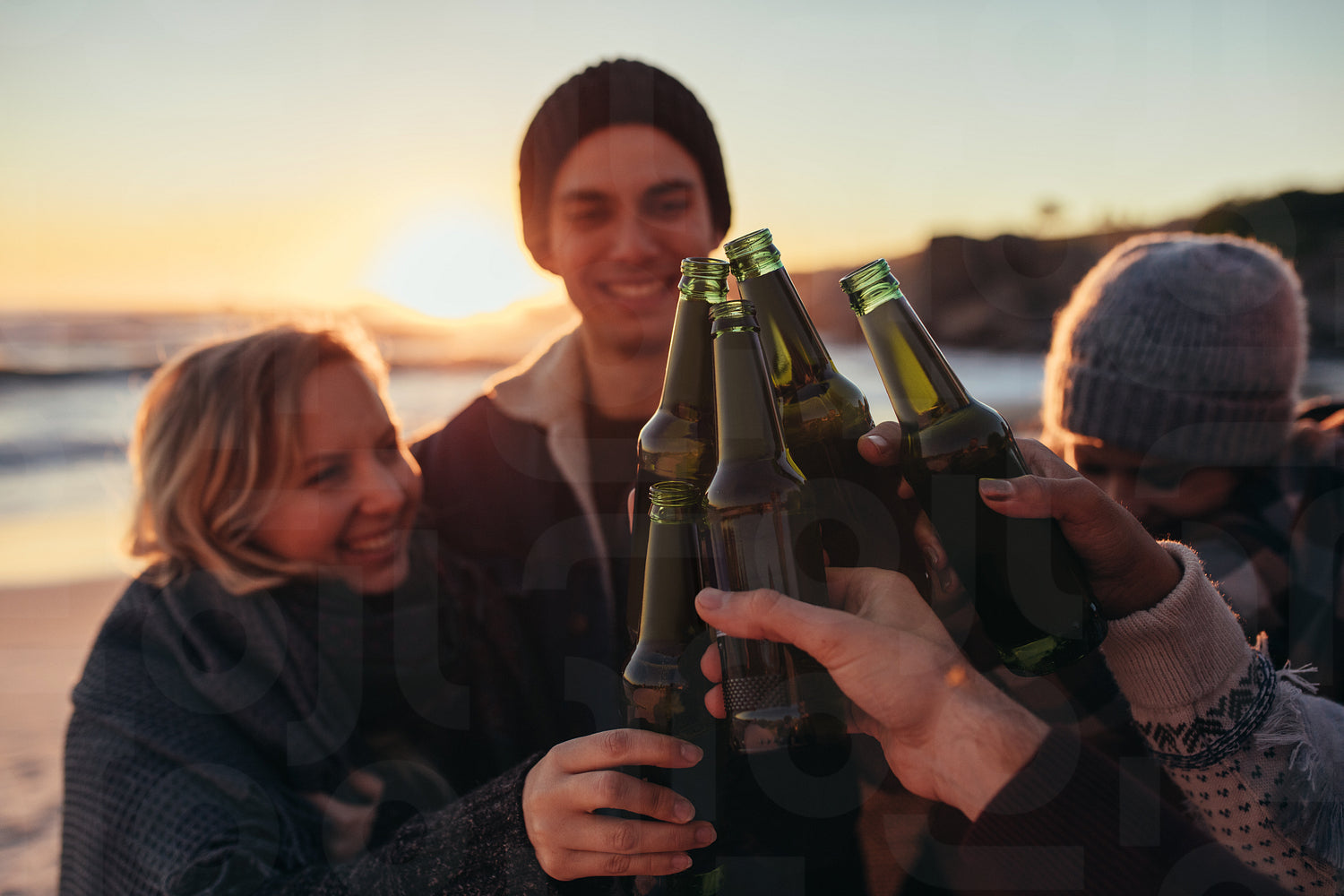Young people toasting with beer bottles on beach. Group of men and women having drinks together at sea shore during sunset.