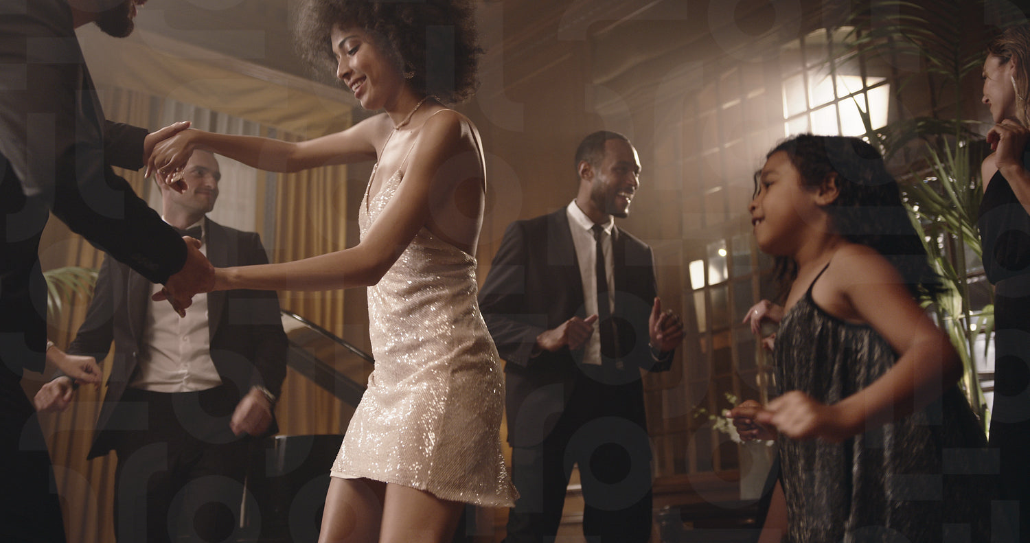 Couple dancing holding hands with a girl jumping around in a party. Rich people having fun at gala party.