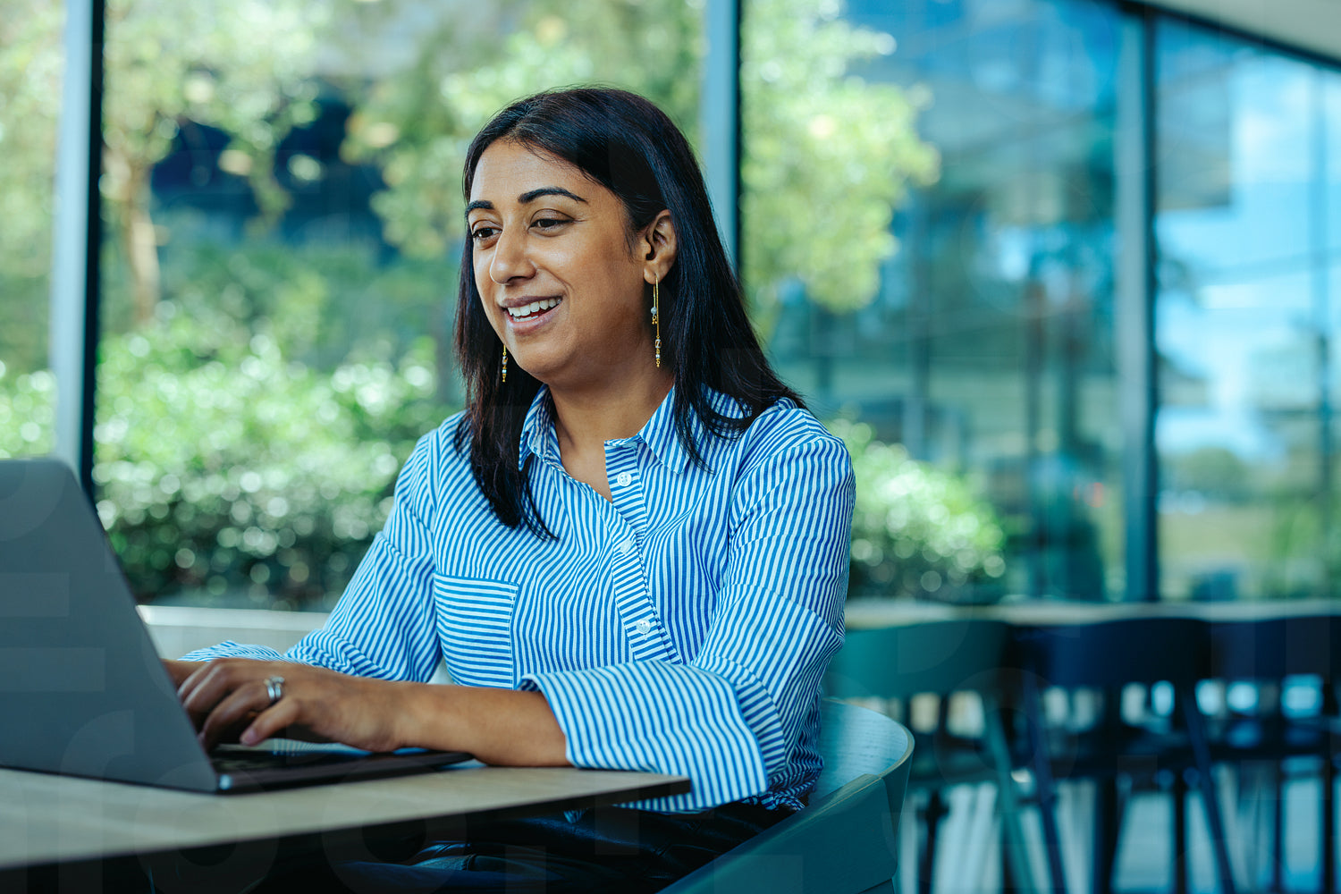 A professional female lawyer is seated at a desk in a contemporary office setting, working on her laptop. The background features large windows with greenery outside, creating an inspiring workspace.