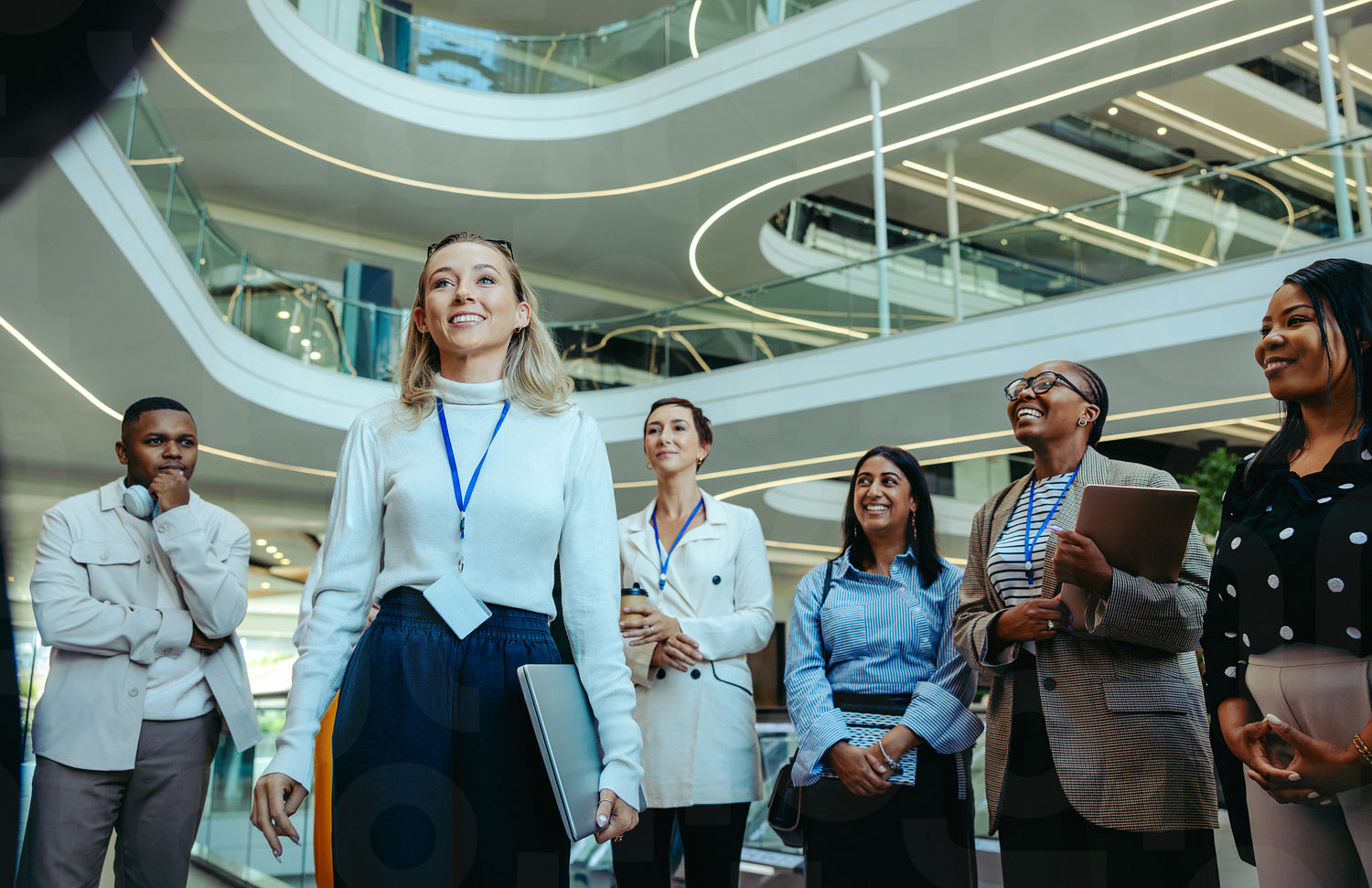 A diverse team of corporate professionals engaged in a discussion within a modern office space, emphasizing business growth, client relations, and financial advisory services.