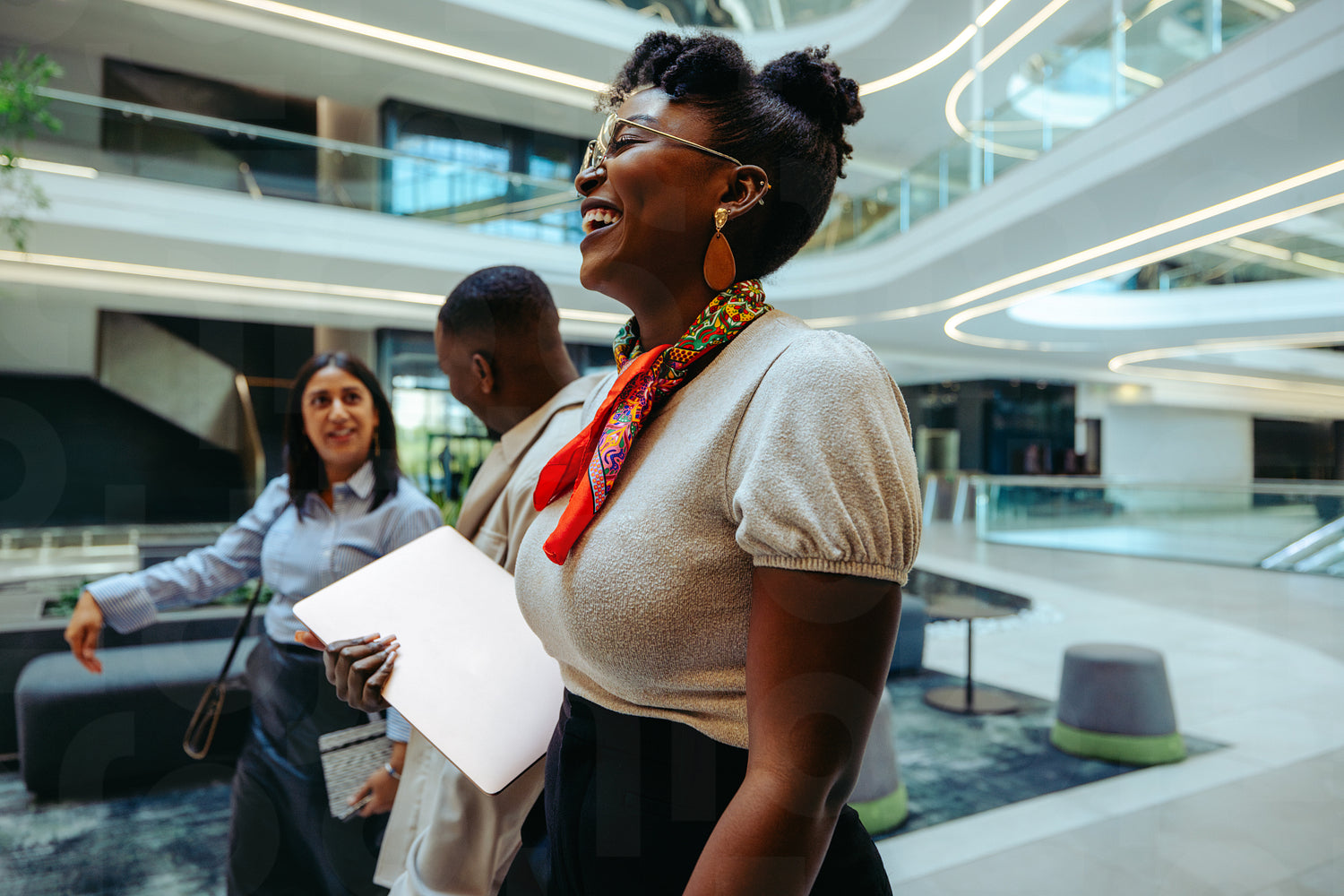 A cheerful African businesswoman engages with colleagues in a modern, open office space. She exudes friendliness while holding a laptop, symbolizing productivity and teamwork.