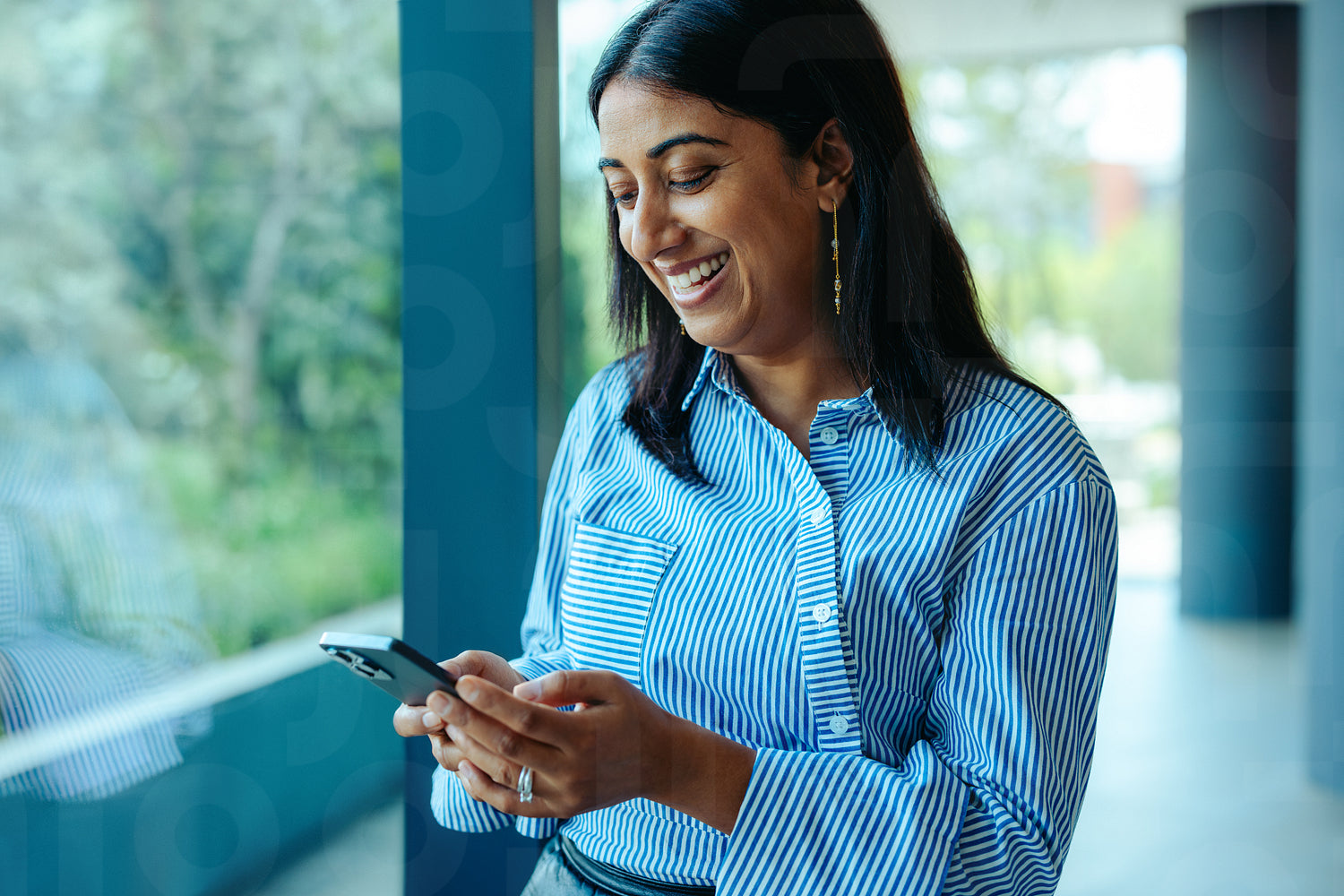 A cheerful Indian business professional is seen texting in a modern office environment. She is smiling and appears engaged, creating a positive and dynamic business atmosphere.