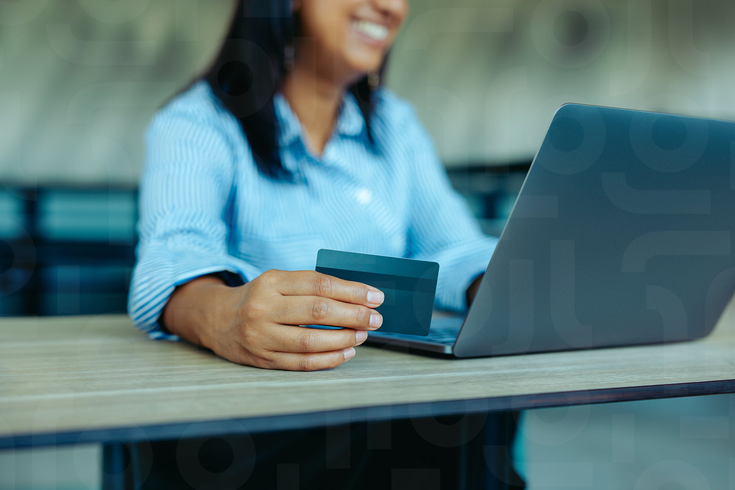 A young woman sits at her desk, engaged in online shopping on her laptop at work. She holds a credit card, illustrating the convenience and accessibility of online commerce.