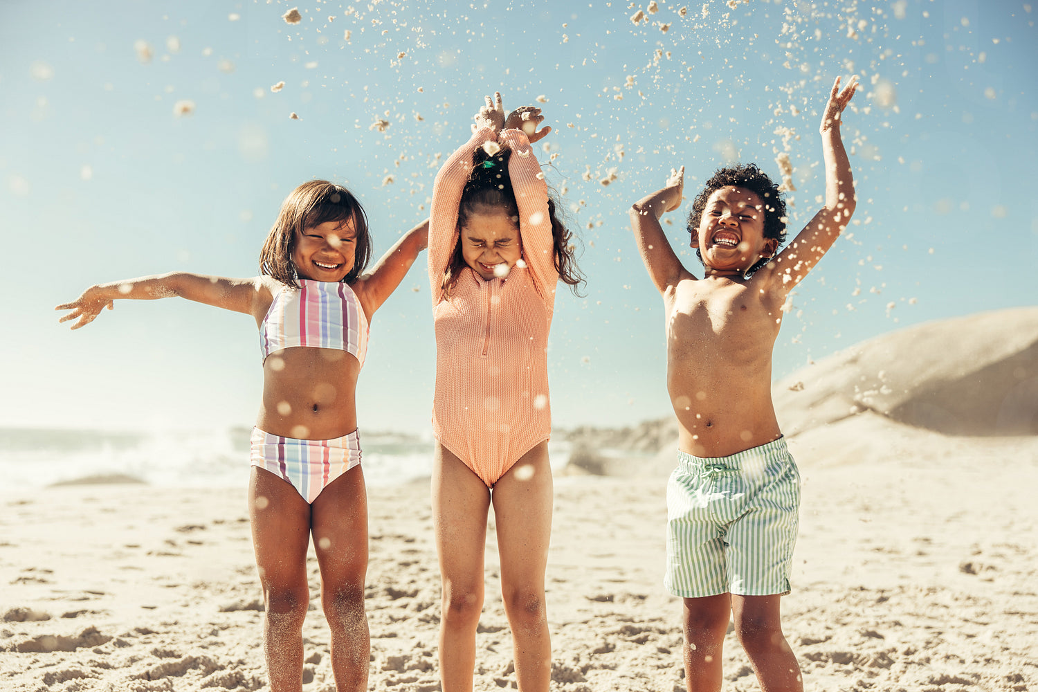 Adorable little kids having fun while throwing beach sand into the air. Group of three happy young children enjoying their summer vacation at a sunny beach.