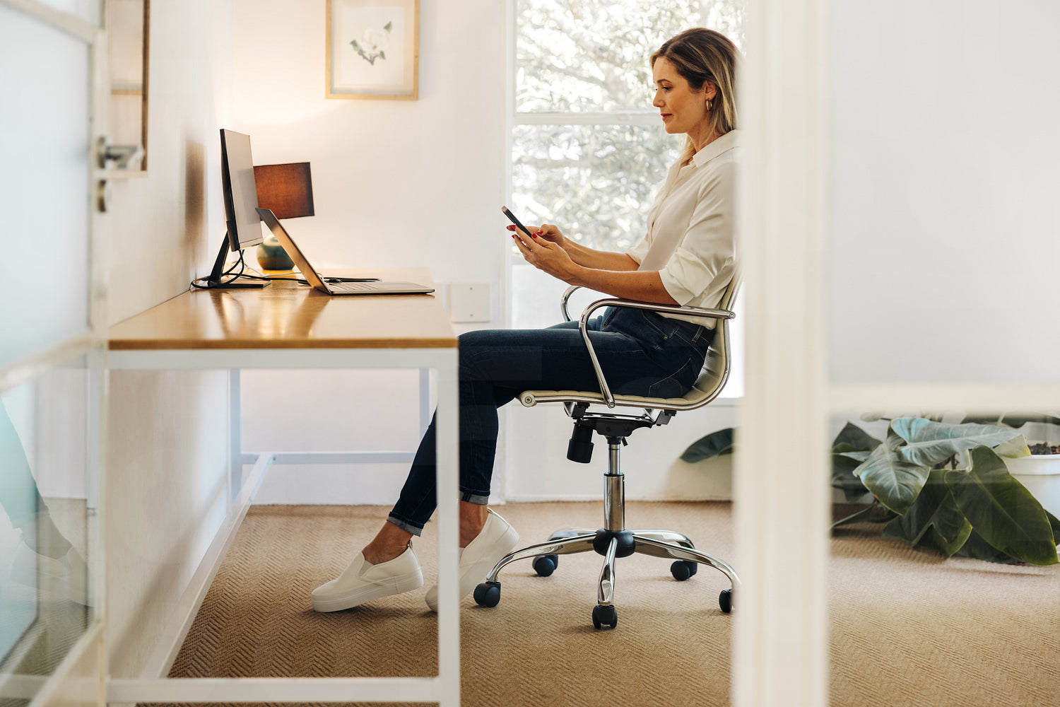 Cheerful businesswoman using a smartphone while working in her office. Young female entrepreneur communicating with her business clients online.