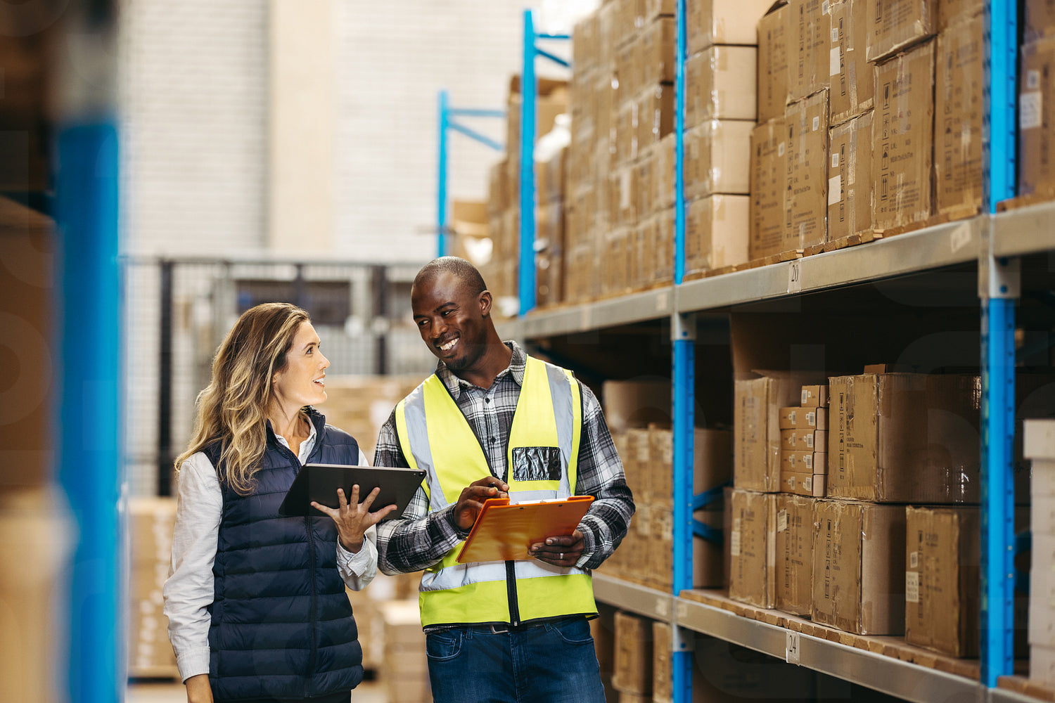 Happy warehouse colleagues smiling at each other while recording inventory. Two cheerful logistics workers using warehouse management software in a modern distribution centre.