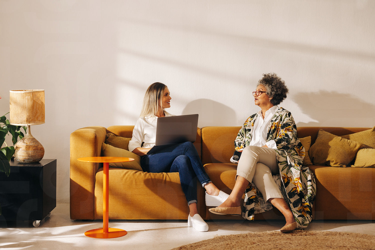Female entrepreneurs having a discussion while working together in an office lobby. Two diverse businesswomen sitting on a couch in a woman-owned company.