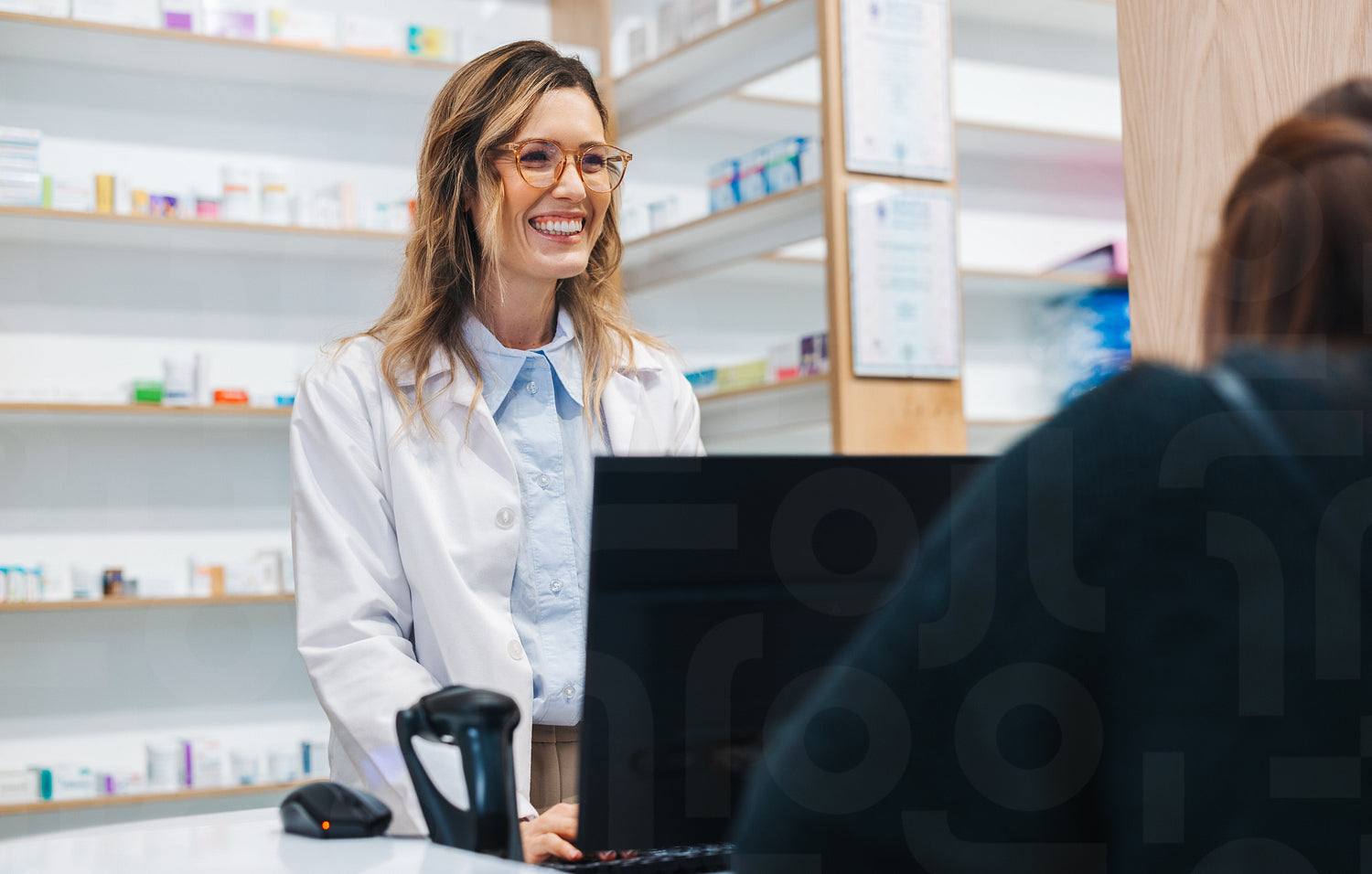 Female pharmacist assisting a patient over the counter in a drug store. Friendly healthcare worker dispensing medication in a pharmacy.