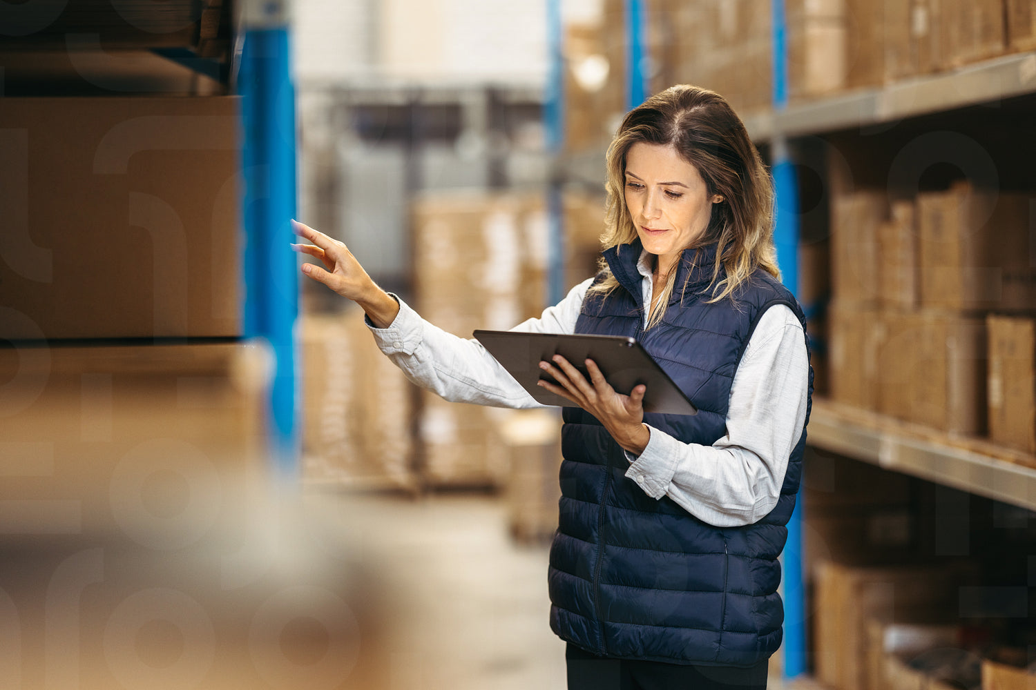 Female warehouse worker looking at an inventory list on a digital tablet. Logistics manager doing stock control using a warehouse management system in a distribution centre.