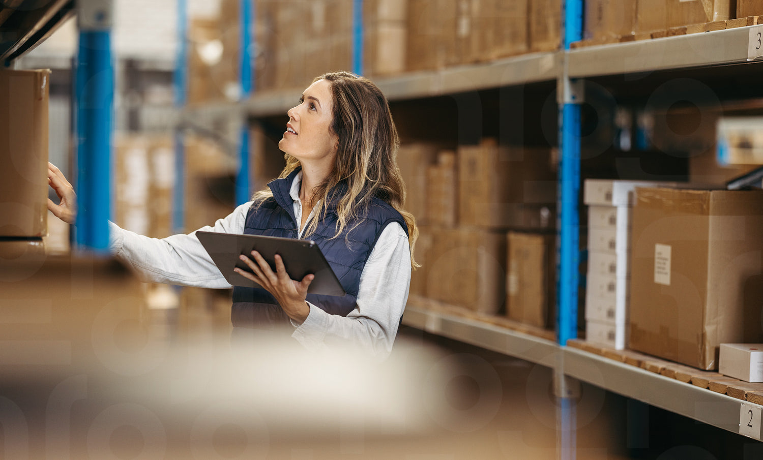 Female warehouse manager counting stock while holding a digital tablet. Woman doing inventory control using warehouse management software in a modern distribution centre.