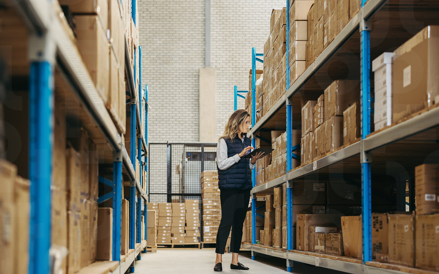 Female warehouse worker doing inventory control using warehouse management software