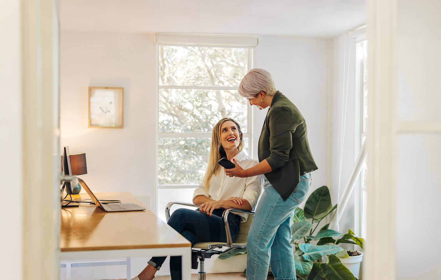 Happy young businesswoman showing her colleague her smartphone screen in a modern office. Two cheerful young businesswomen collaborating on a new task in a woman-owned company.