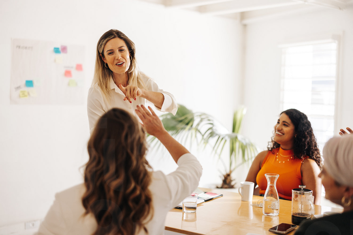 Happy businesswomen high fiving each other during a meeting in a boardroom. Successful businesswomen celebrating their achievement. Diverse businesswomen working together in an all-female startup.