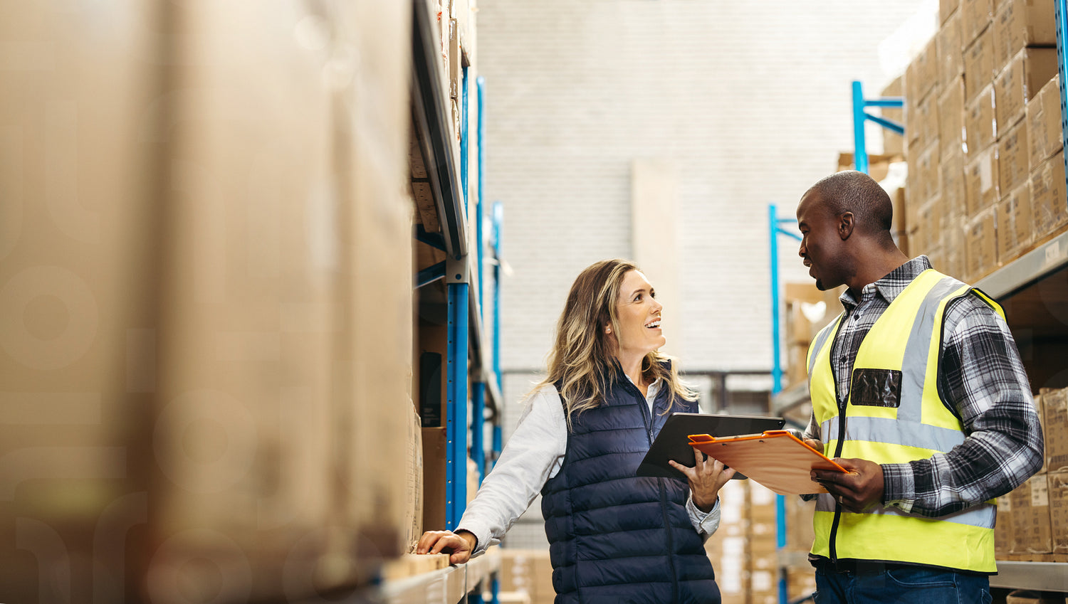 Happy warehouse colleagues having a discussion while recording inventory. Two cheerful logistics employees using a warehouse management system on a digital tablet.