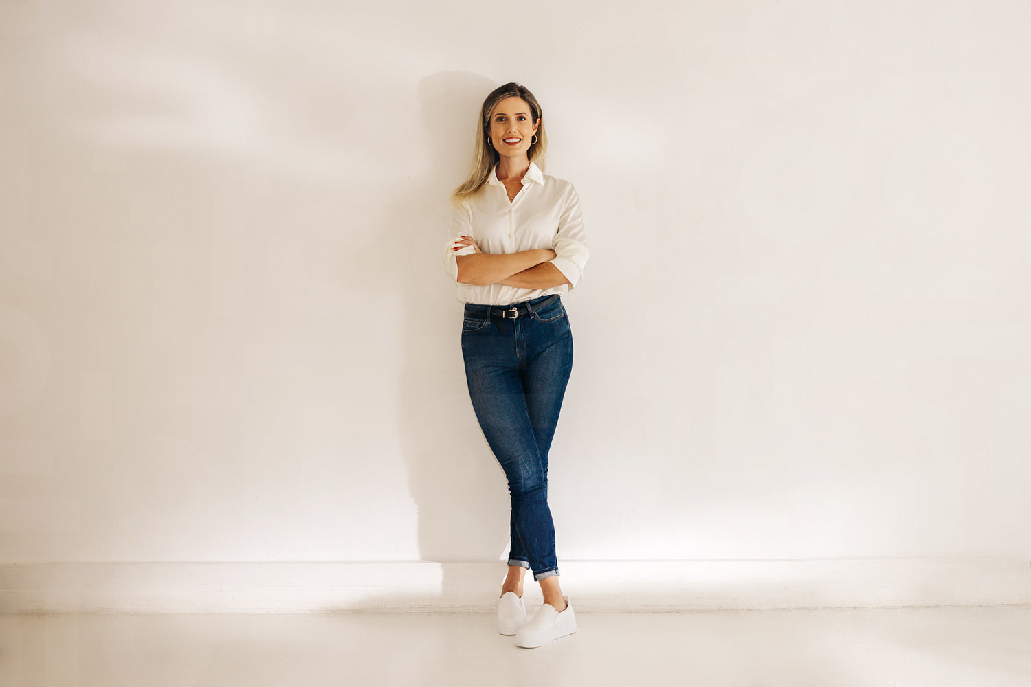 Happy young businesswoman smiling at the camera while standing with her arms crossed. Cheerful businesswoman standing against a wall in a modern workplace.