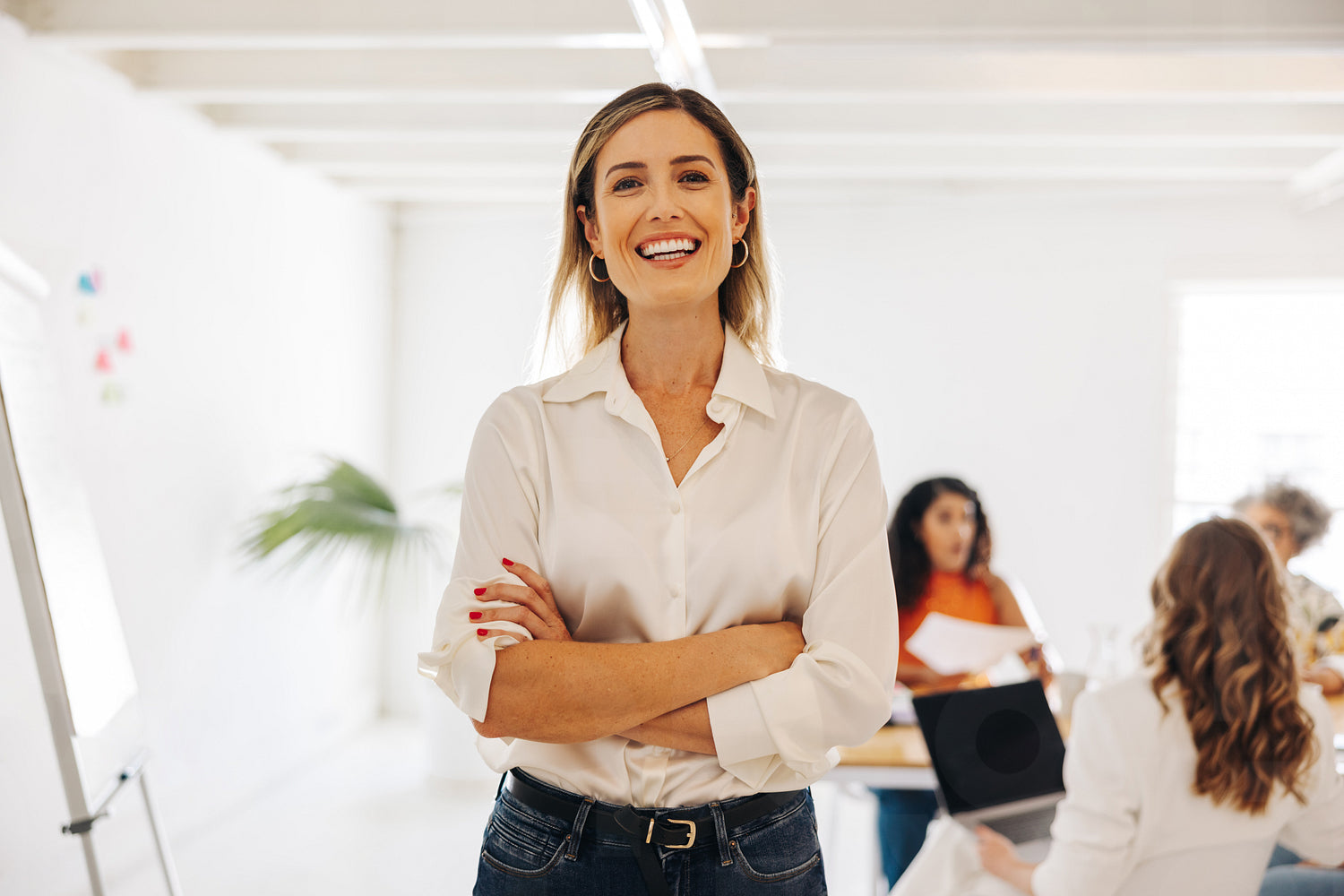 Happy young businesswoman smiling at the camera while standing in a meeting room. Cheerful young businesswoman attending a meeting with her colleagues in an all-female office.