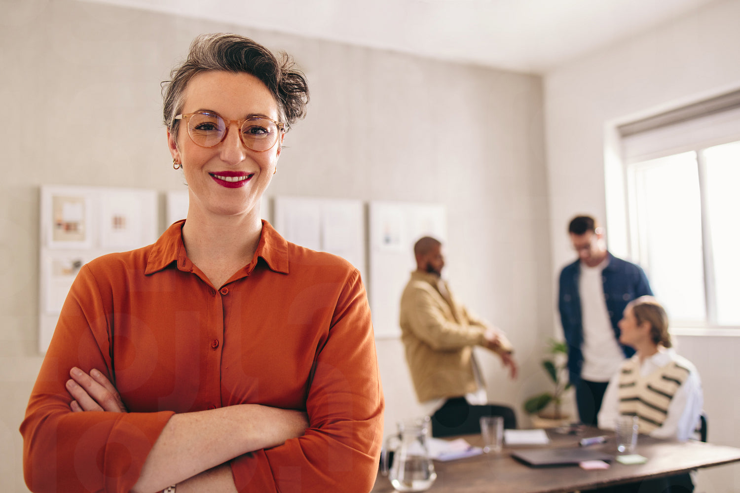 Portrait of a mature businesswoman smiling at the camera while standing in an office with her arms crossed. Happy businesswoman working in a creative workplace with her colleagues.