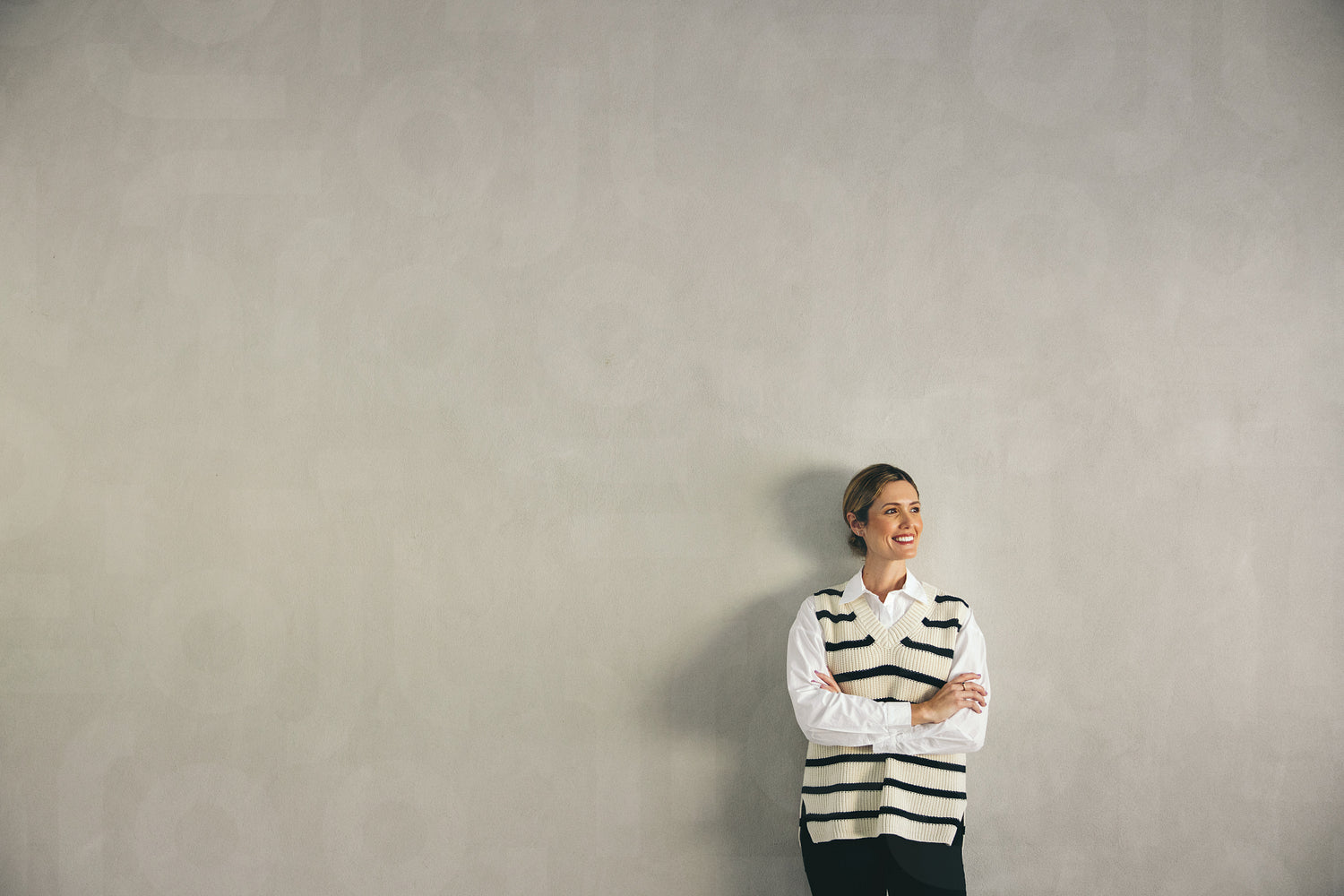 Smiling businesswoman looking away while standing against a grey wall with her arms crossed. Happy young businesswoman wearing business casual in a modern office.